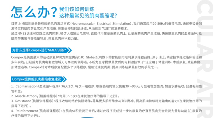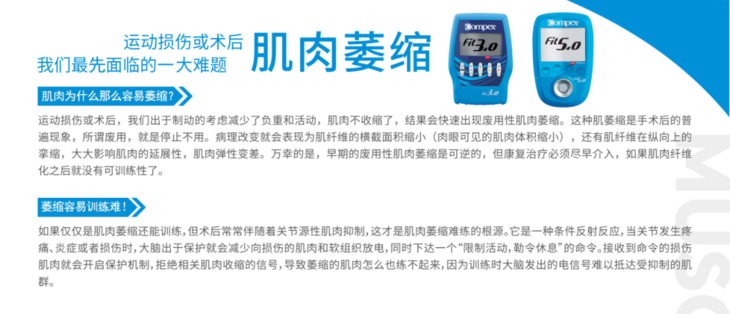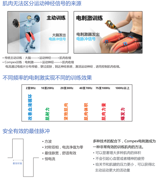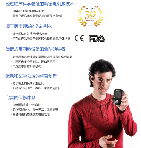 Compex源于瑞士并经过多年的实践,已经成为肌肉电刺激领域无可争议的领导者。目前广泛用于体能训练,健康恢复,减轻疼痛,形体塑造等。Compex拥有经过临床验证的精密技术,是提高运动成绩的最有效手段之