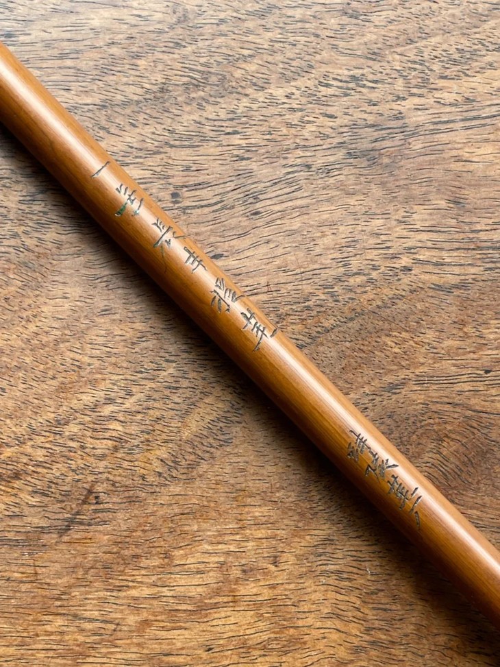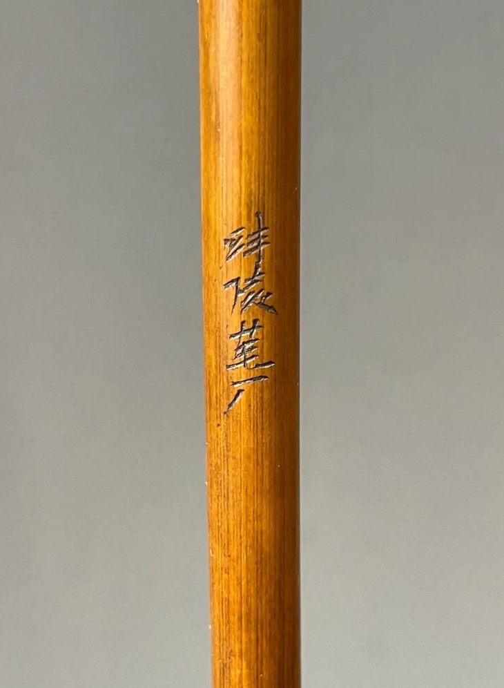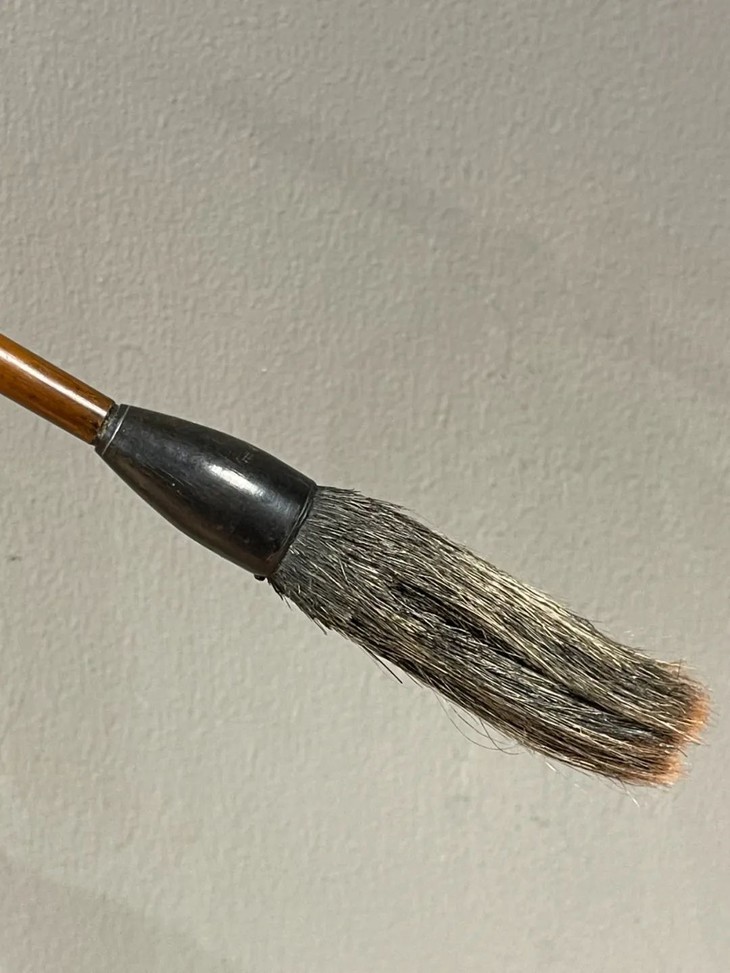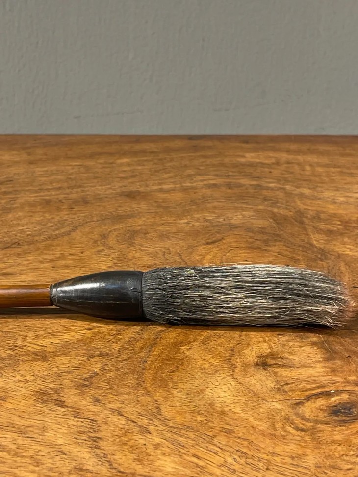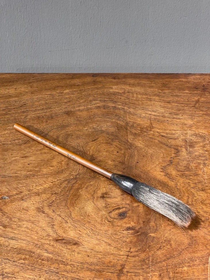 这是一件以质地精良稀少的的天然水牛角与竹管琢磨而成的狼毫大楷毛笔,以质量特别好的水牛角琢磨镶嵌狼毫大楷笔头,配上细竹管而成貴气的打楷毛笔。水牛角质地坚硬,包浆浑厚温润,纹理清晰,如行云流水,竹管笔柄色泽柔美,质地温润,狼毫细緻软硬适中,色泽柔美、质地油亮,非常美丽。笔杆阴刻老字号毛笔品牌“一号長丰提笔, 沣陵笔厂”,应是解放后1970年代的高端毛笔。