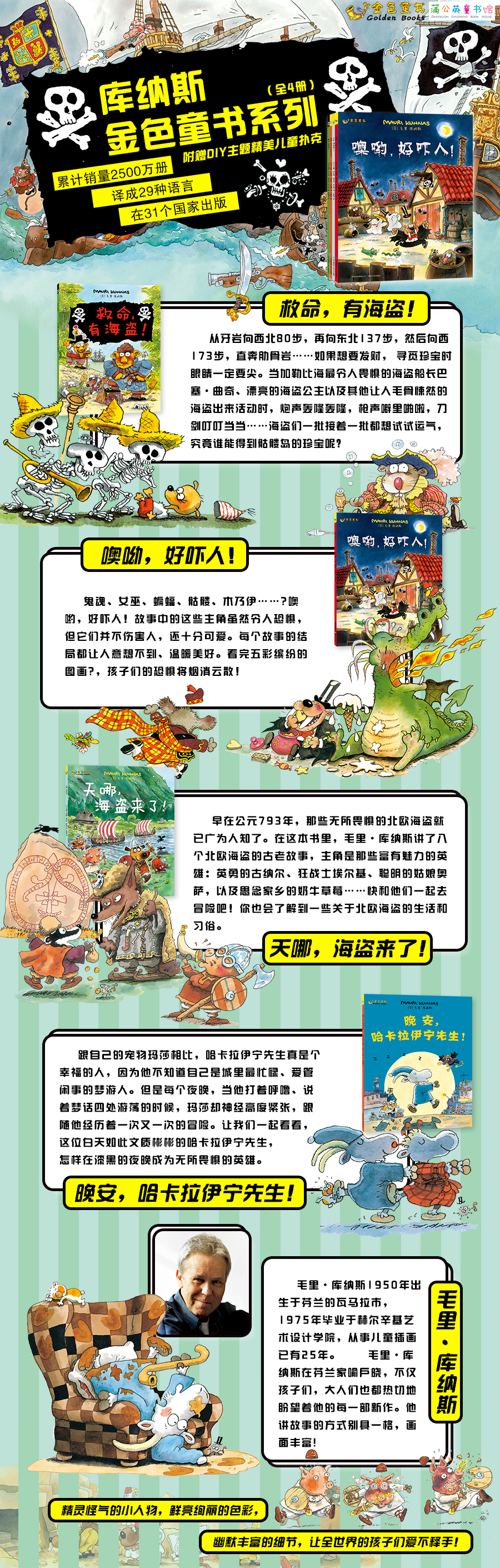 快乐。这四个发生在爪子村的故事,每一个都人物丰富,色彩绚丽,充满丰富而幽默的细节,为读者提供无与伦比的阅读乐趣。我们看到哈卡拉伊宁先生的“反差萌”,白天中规中矩,夜晚无所畏惧;看到相似的镜头重现,小时候玩海盗游戏遗失的宝藏,几十年后还能被挖出。或许每个孩子都期盼过天黑不睡觉,库纳斯就带着我们,看夜里发生的想也想不到的故事;七大奇迹既可以是宏伟的文明胜迹,也可以成为梦幻刺激的游乐场。库纳斯记住了当孩子时的感觉,用故事和插图,为现实和心灵的孩子照亮童年。