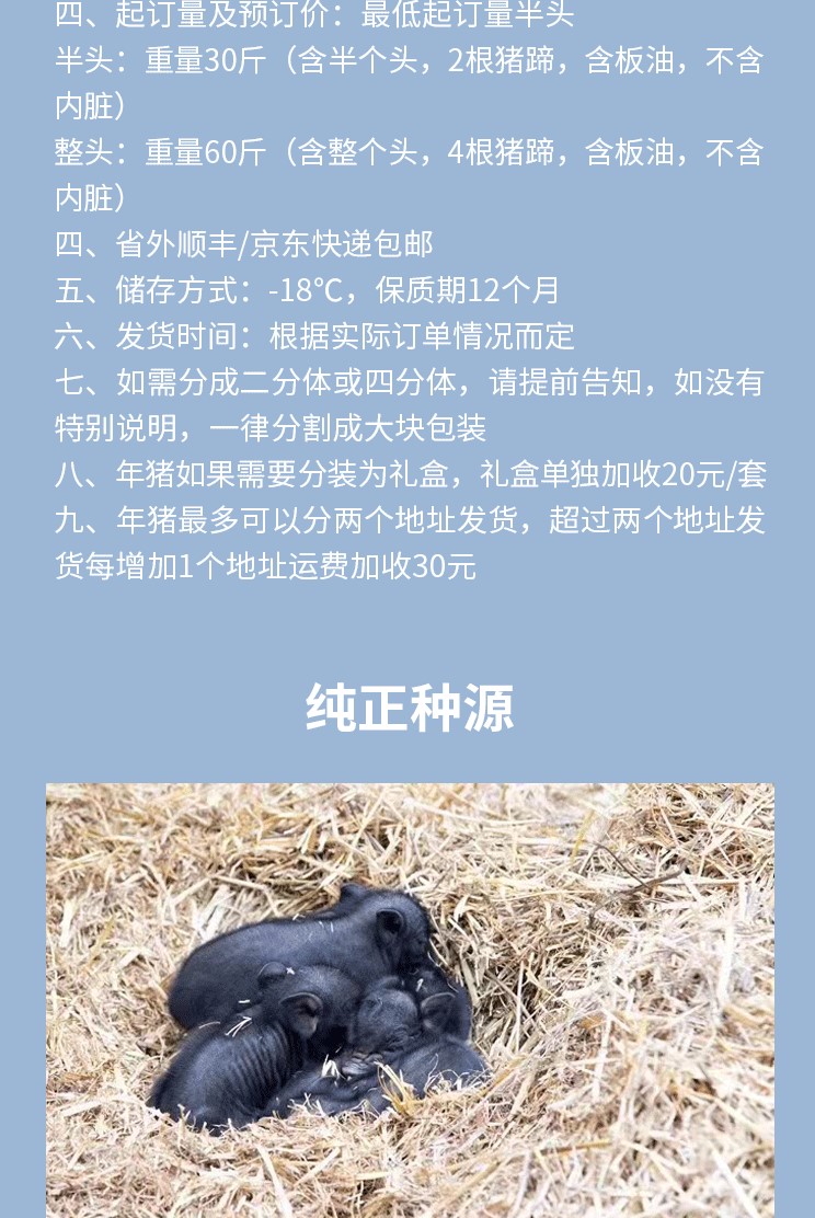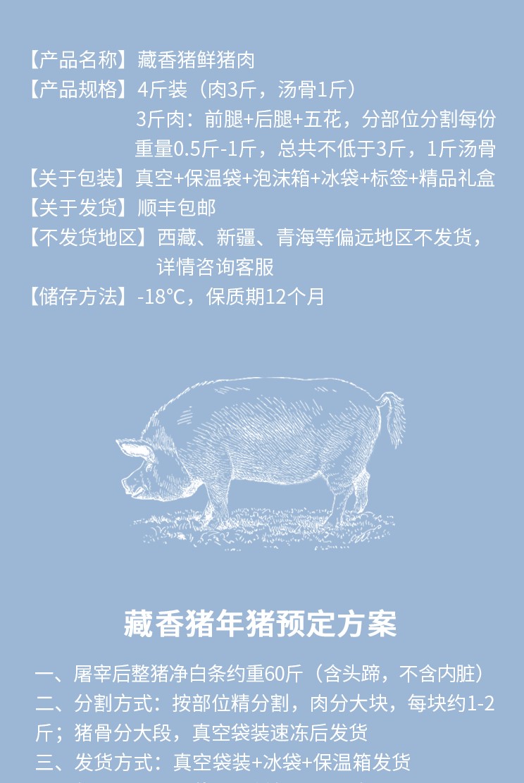 3斤肉:前腿+后腿+五花,分部位分割,每份重量0.5斤-1斤,总共不低于3斤重;1斤汤骨(龙骨/棒骨):