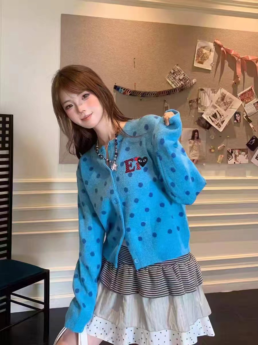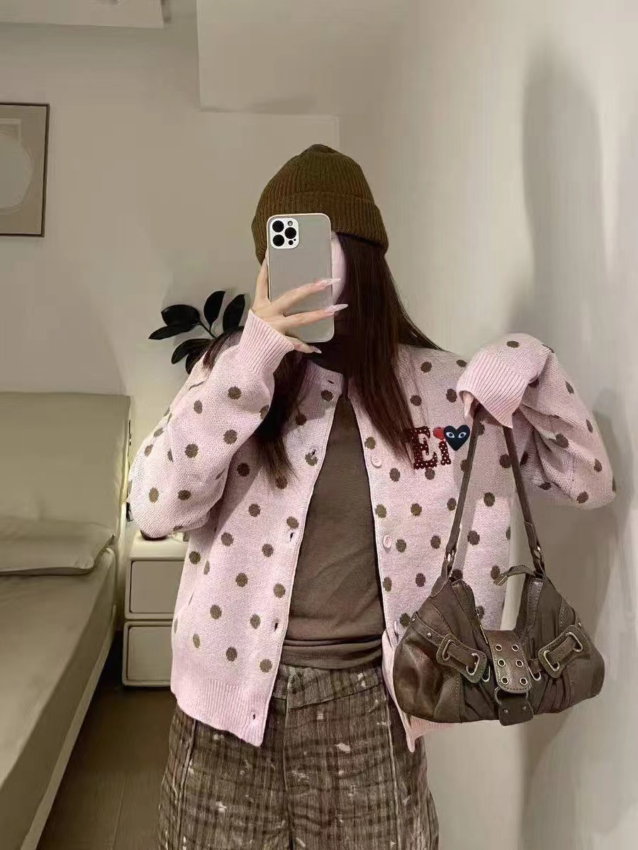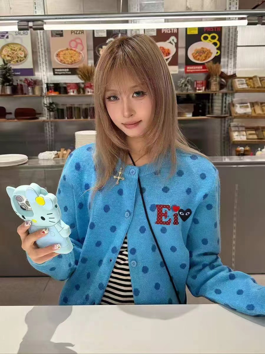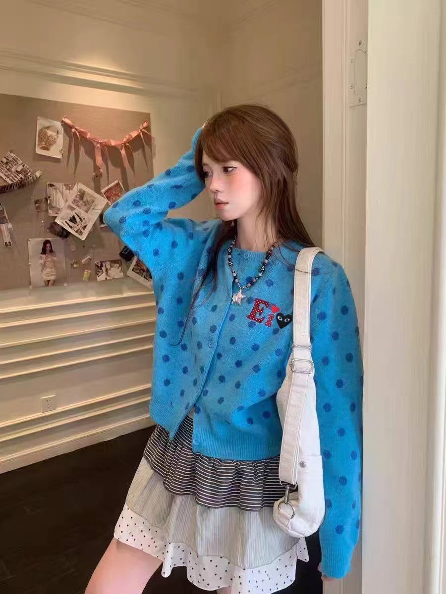 圆领单排扣针织开衫,版型宽松休闲,衣长偏短,对小个子友好且能优化身材比例。主体为清新明亮的颜色,满印同色系深波点,复古俏皮又充满元气感。柔软的针织面料,触感舒适,兼具保暖性与视觉蓬松感,适合春秋季节叠穿或单穿。爱心刺绣,趣味感十足,是视觉焦点。圆领、袖口与下摆均采用罗纹收口,贴合身形,不易变形,门襟为同色系圆形纽扣,简约耐看,与整体风格统一。美式复古+日系可爱风,活泼减龄,适配牛仔裤、工装裙等下装,适合日常出街、约会等轻松场景。