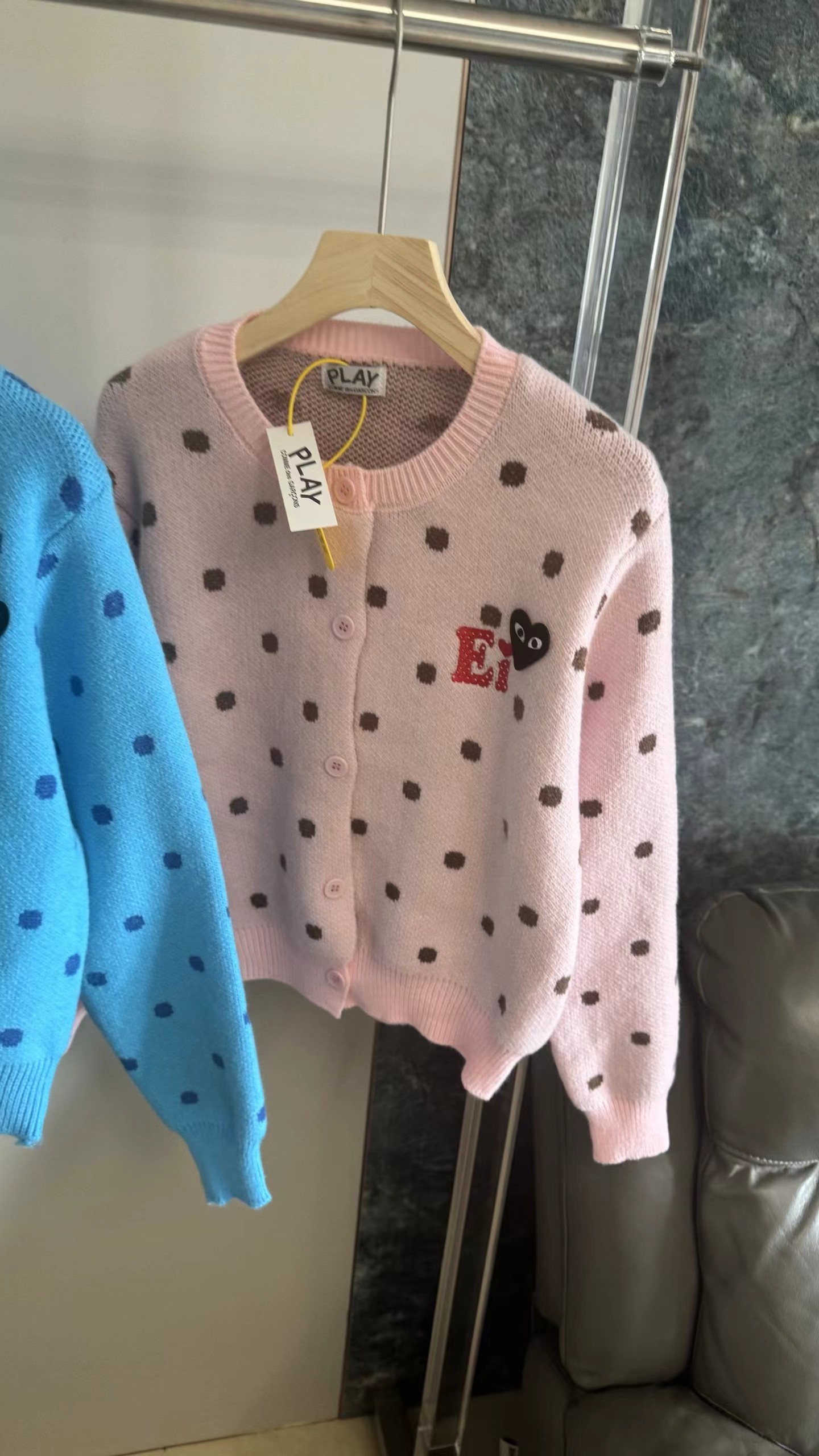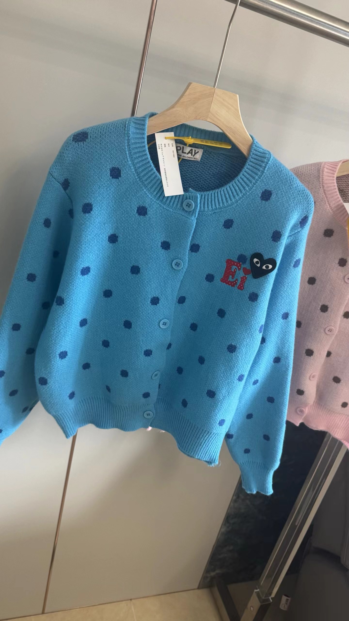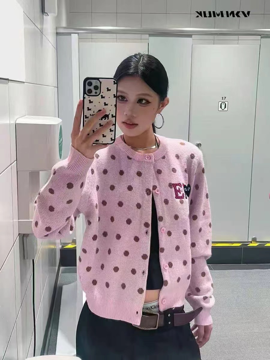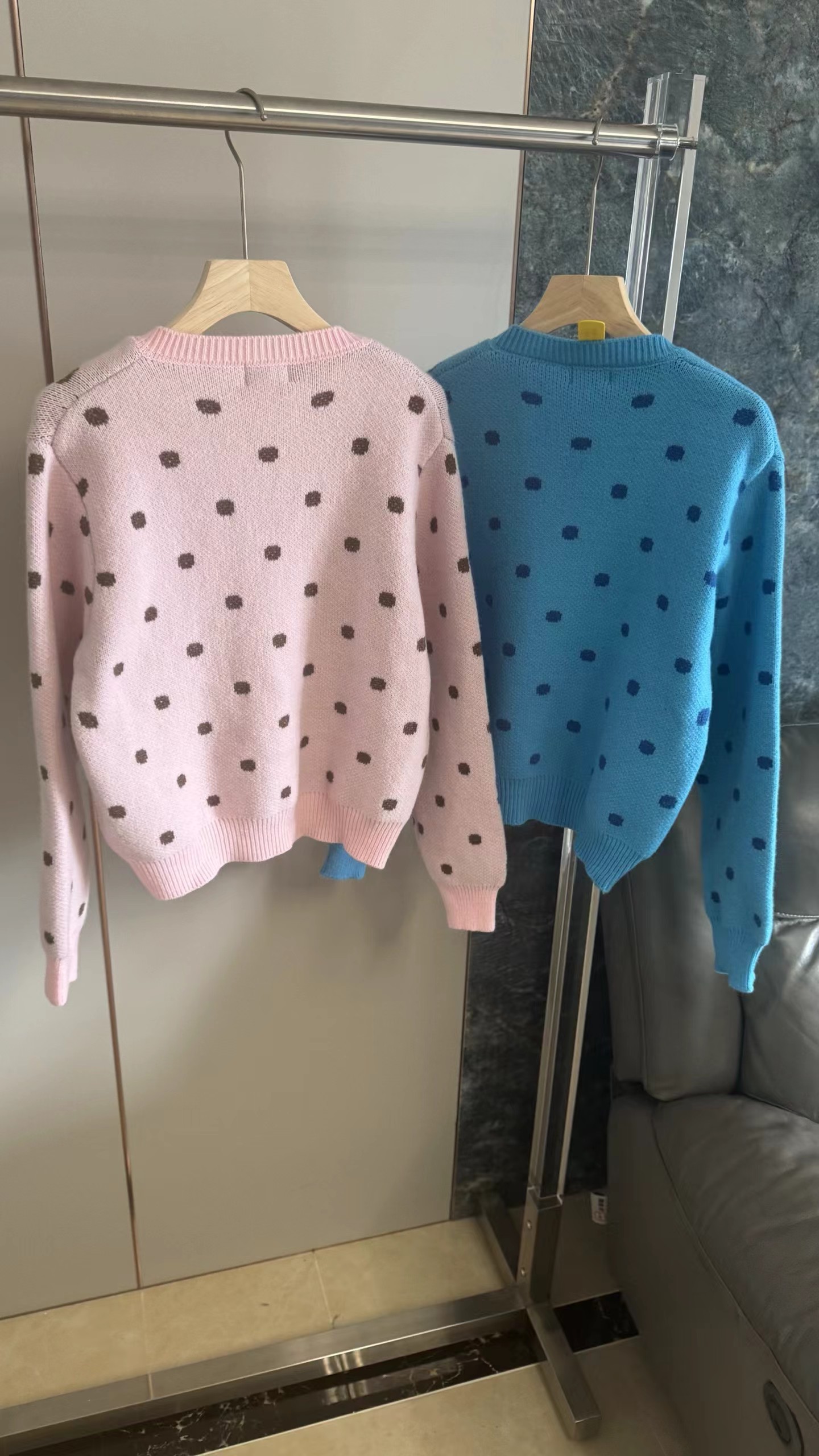 圆领单排扣针织开衫,版型宽松休闲,衣长偏短,对小个子友好且能优化身材比例。主体为清新明亮的颜色,满印同色系深波点,复古俏皮又充满元气感。柔软的针织面料,触感舒适,兼具保暖性与视觉蓬松感,适合春秋季节叠穿或单穿。爱心刺绣,趣味感十足,是视觉焦点。圆领、袖口与下摆均采用罗纹收口,贴合身形,不易变形,门襟为同色系圆形纽扣,简约耐看,与整体风格统一。美式复古+日系可爱风,活泼减龄,适配牛仔裤、工装裙等下装,适合日常出街、约会等轻松场景。