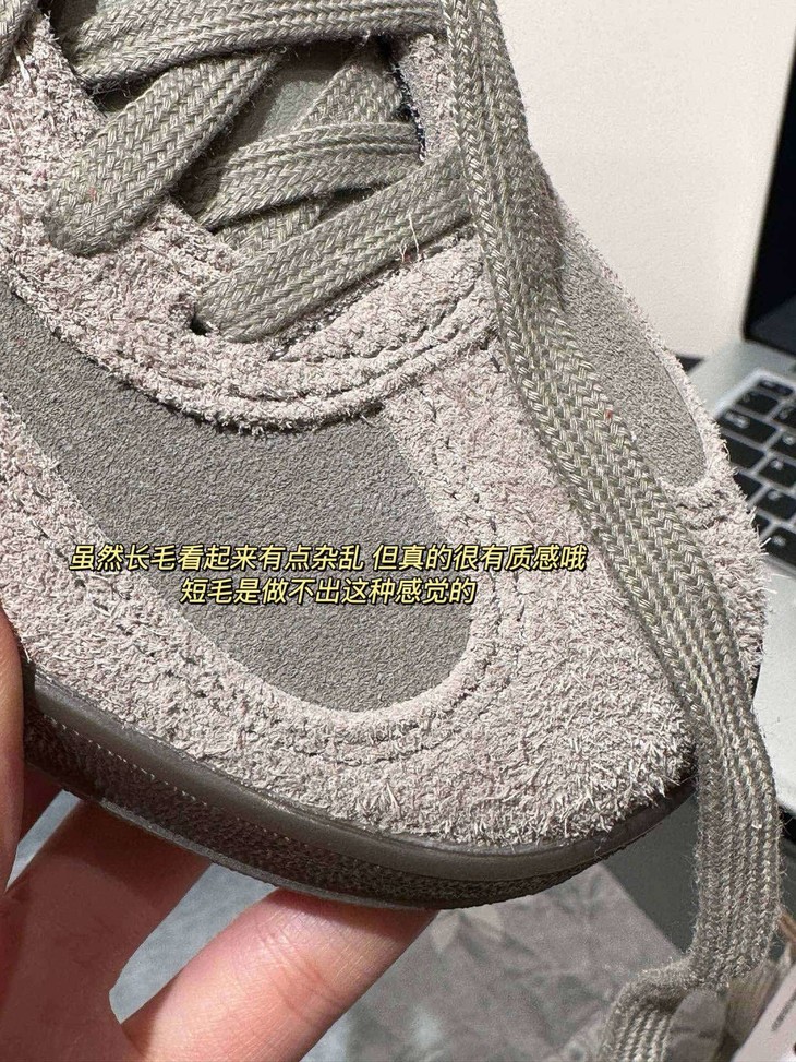 有非常明显的倒绒感,因为是胎牛皮所以手感更加柔软更加有韧性 尤其是那种丝光感