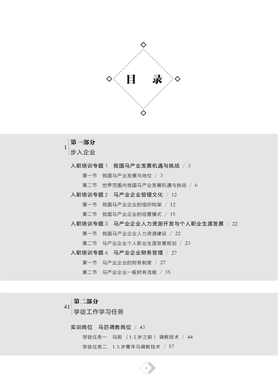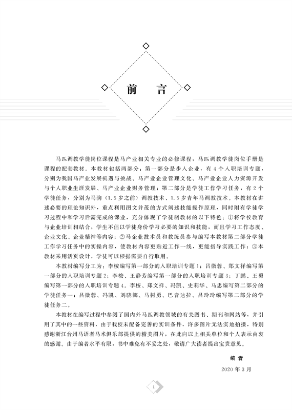 本教材是*第三批现代学徒制试点项目成果,以国际标准马匹调教技术为主,参照国内知名马术俱乐部马匹调教主要做法,由校企合作共同开发,操作性、实用性、推广性强,是国内马术职业教育教材的先行试点。本教材为学生以学徒身份在企业学习提供知识和技能指导,也可以作为企业进员工培训手册。