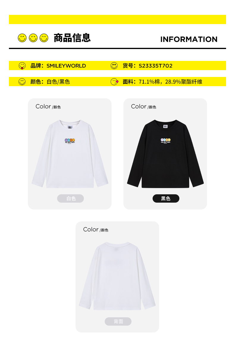 SMILEY WORLD法国笑脸童装长袖t恤百搭男童女童上衣S23335T702