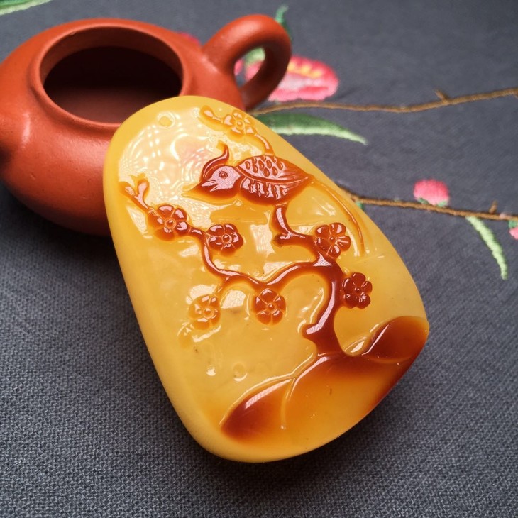 【46361】蜜蜡喜上眉梢挂件,天然波罗的海料子,微矿点,蜜纹丝丝缕缕。雕刻精致,形状饱满厚庄。巧雕喜鹊站立葫芦藤上,生灵活动,寓意福禄双至,喜上枝头...克重26.5g,尺寸52.8*38.6*21.6mm,结缘价2780