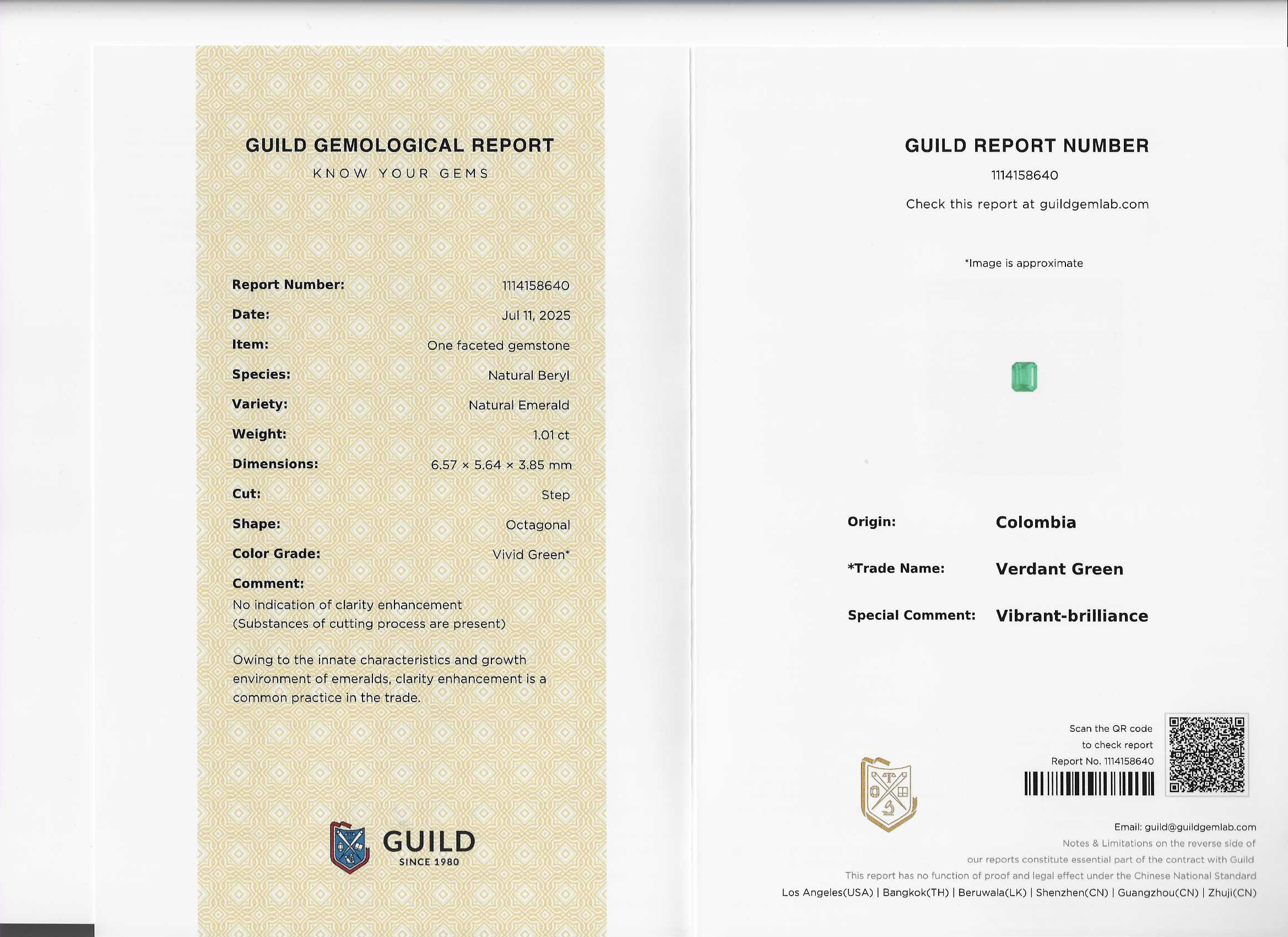 祖母绿石重:1.01克拉