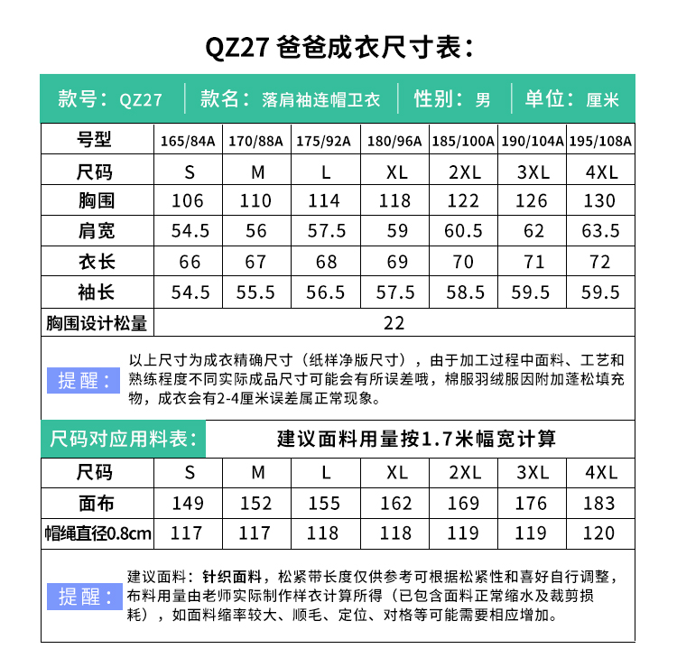 裁缝学苑QZ27亲子装落肩袖连帽卫衣纸样男装服装打版裁剪图纸样板