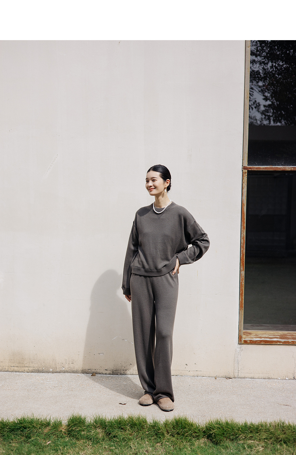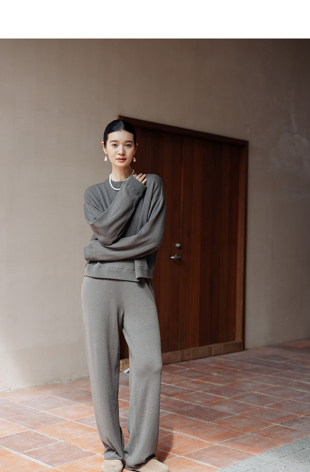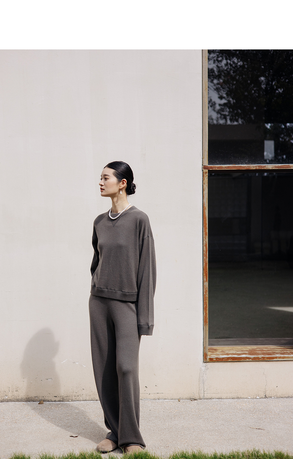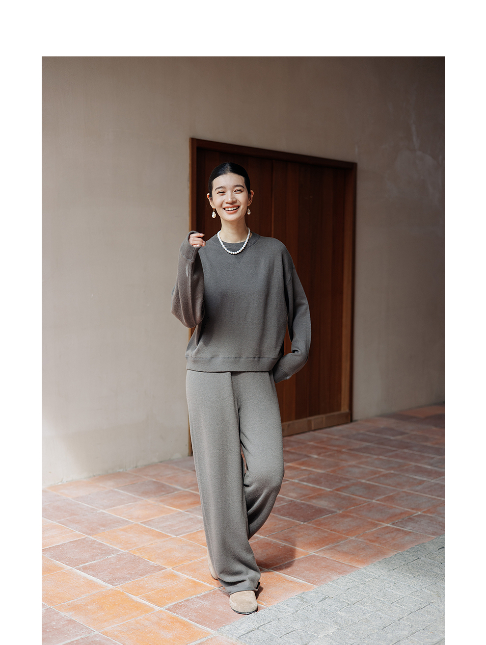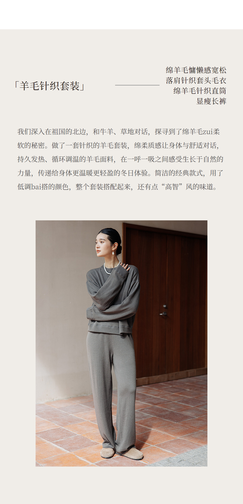 绽放665-JC666朵/绵羊毛慵懒感宽松落肩针织套头毛衣直筒长裤套装