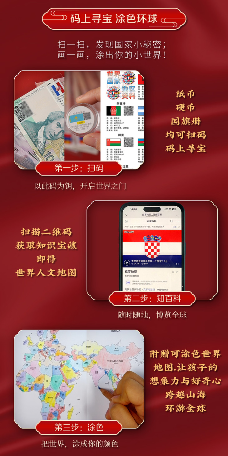 1、纸币袋子包含国旗、国家和地区的简介、二维码。扫二维码有国家和地区的详细介绍。
