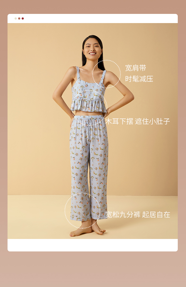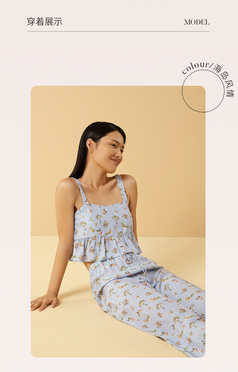金三塔100%桑蚕丝印花荷叶边女士真丝睡衣印花吊带长裤套家居服可外穿 YSFCB404