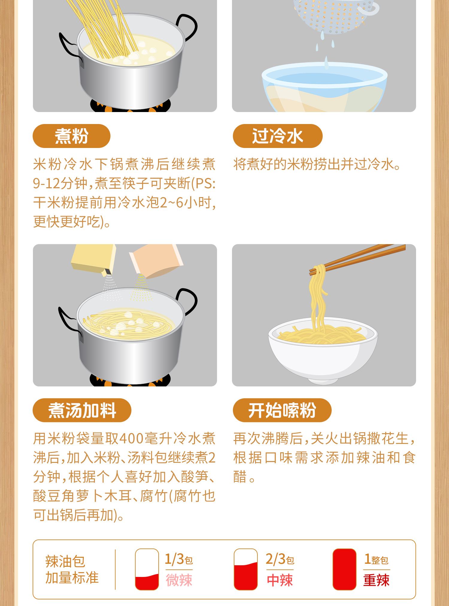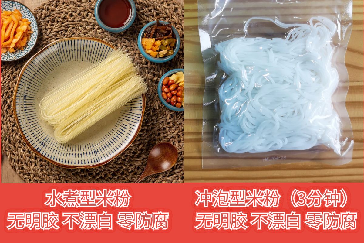 我们找了十几家粉厂,终于选到符合国标检测,无明胶,无漂白,无防腐剂的米粉。0添加*防腐版,我们也还是出品水煮型和冲泡型米粉(三分钟可嗦粉)。