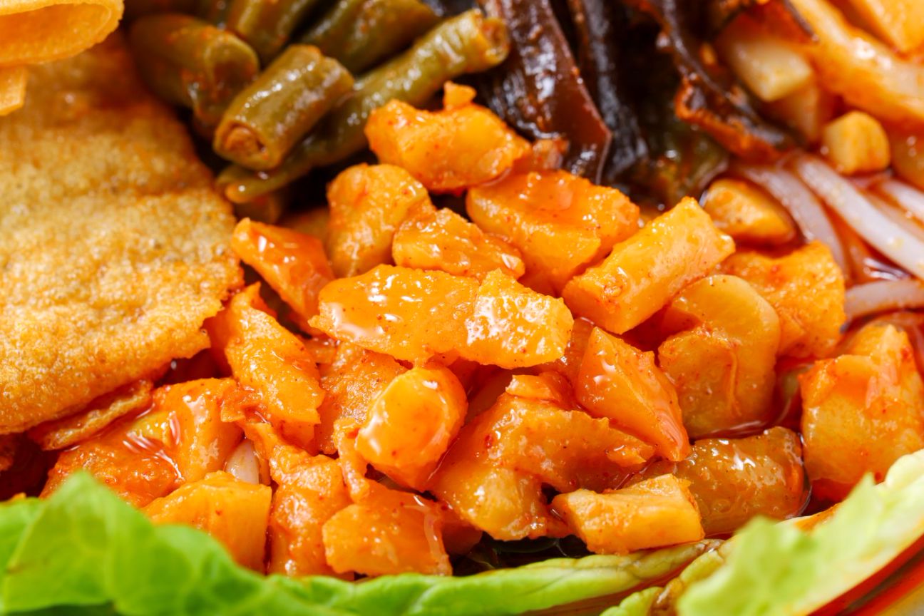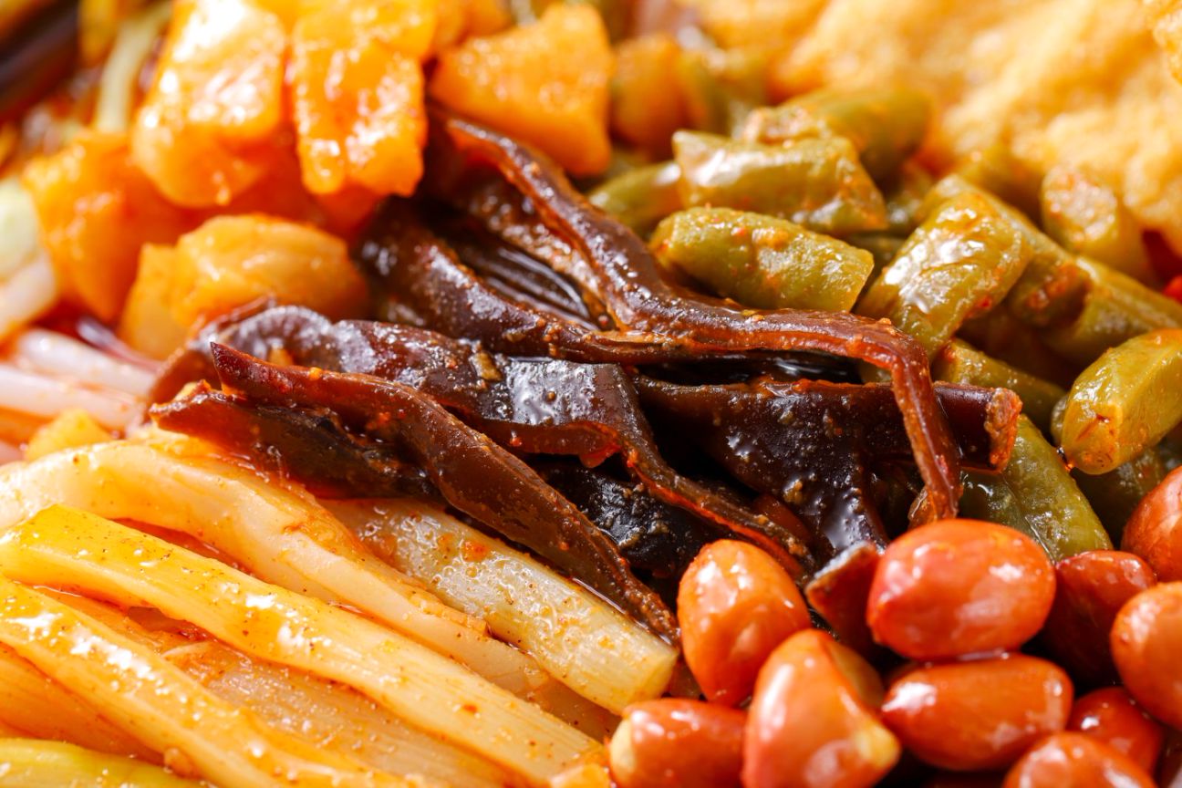 酸豆角萝卜木耳包:酸豆角(豆角、饮用水、食用盐、食醋)、木耳、萝卜丁(萝卜、饮用水、食用盐)、食用植物油、冰糖、辣椒、香辛料。