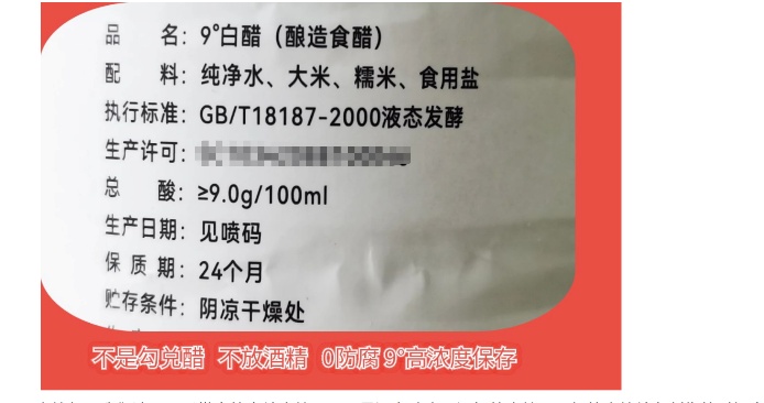 我们的醋大概是5g左右,而且是9度酿造白醋为原材料。为什么用9度,因为只有这样浓度的醋,才可以不用防腐剂,也不用酒精保存。不喜欢吃酸的,先不要加醋哦,或是先加一点点,甚至不加。