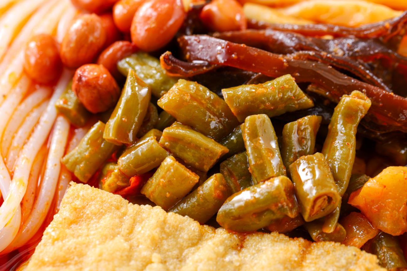 而我们风味粉的特色之一,正是在这辣味之中,资深的“嗦粉党”,一定是要加一层红红的辣油,配菜满蘸香油和辣油,里面还吸了汤汁,一口放进嘴里,辣味,香味,卤味,纷至沓来。