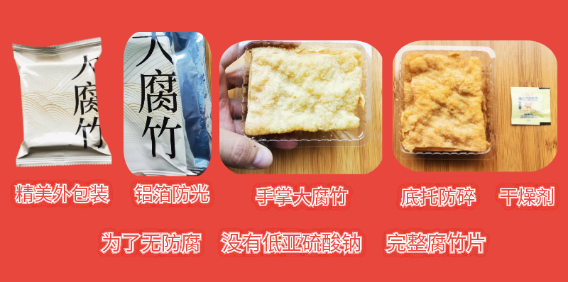 腐竹包,我们选用了手掌大的大片腐竹,而且是没有防腐零添加的腐竹。一般的腐竹片在制作的时候会加有低亚硫酸钠(作用:漂白,防腐,消毒,脱水),不然腐竹就需要烘烤得很干,运输容易碎,造成许多不便。为了做不加防腐剂的腐竹,厂家制作腐竹的时候需要烘干些,且没有那么抛(就是腐竹比较松,没有添加(低亚硫酸钠)的腐竹比较结实),炸出来的腐竹,因为比较容易碎,我们在包装上下了功夫,加多一个底托再包装,为了延长保质期,里边还加了干燥剂,这样就实现了0添加的腐竹。