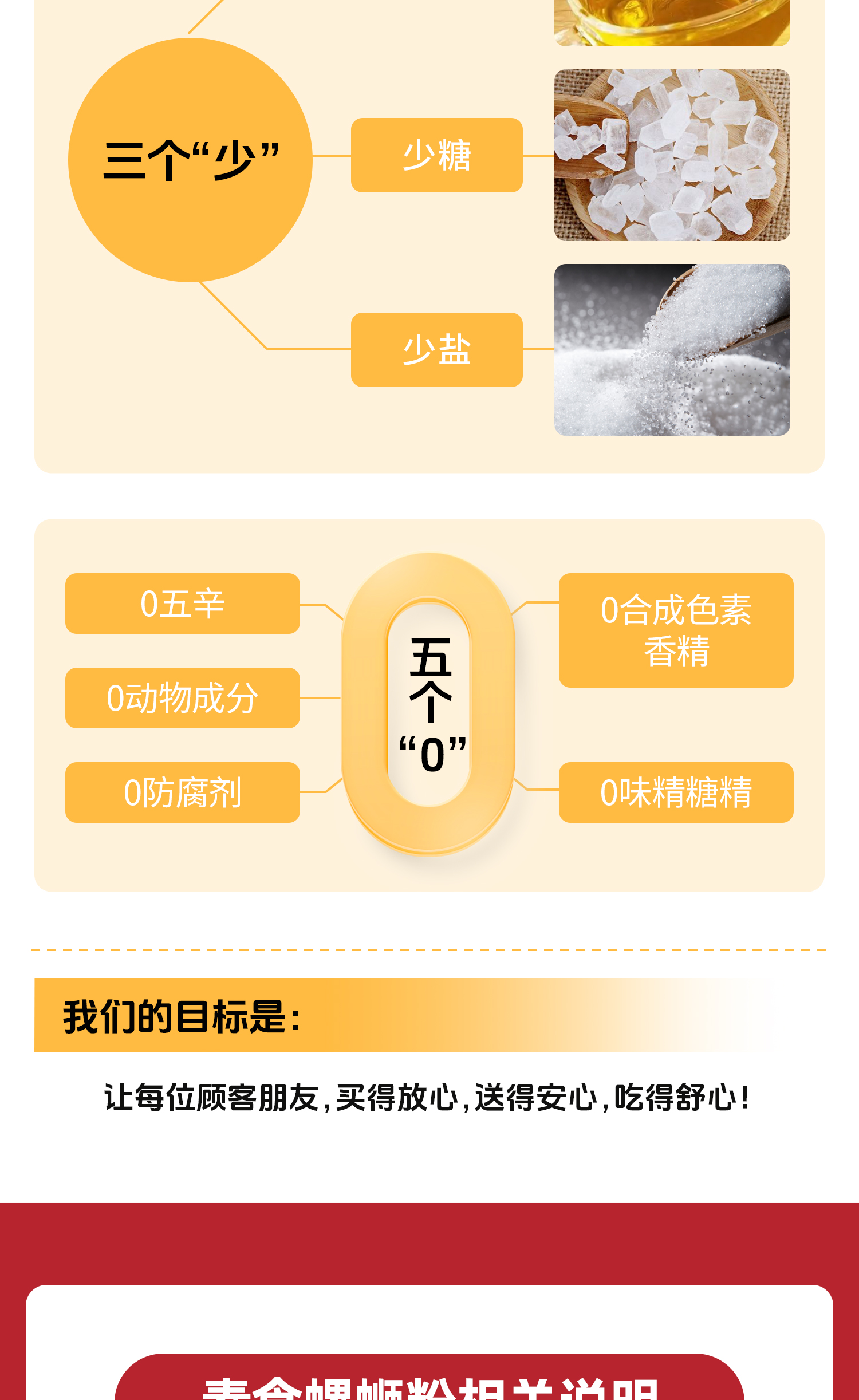 0添加*防腐素食螺蛳粉,一直放在心上。使用鲜湿米粉,冲泡更加方便,但是需要企标,原来工厂没有申请这个类目的生产资质,今年我们启用新工厂,就申请了企业标准。所以从去年年底开始我们又开启了这项工作。找了半年多,发现一家配菜企业的酸笋包,酱菜包都符合0添加和素食标准(配料表非常干净),当时可高兴啦,觉得曙光出现了。我们就联系了这家企业的老板,沟通、品鉴、考察,来来回回两三个月,都基本谈好了,准备要签约定制合同,因为螺蛳粉的酱菜一般在炒制时需要放辣油,而辣油一般会放有葱蒜,这样辣油更加香,所以我们在合同里特别要求所有的原材料不得含有动物成分,蛋奶,五辛,酒精。这个老板也很有责任感,看到我们这么认真执着,合同都要写那么细,就下去问生产的所有环节的负责人,在这样“严刑逼供”下,有一个环节出现问题了,在食用油调制的环节,放有微量的猪油和鸡油来调味。老板也如实的告知了我们。这一下把我们前面的工作都白费了,需要重新寻找。真是一波三折。这一次又刷新了我们对食品生产的认知,配料表其实不一定把所有成分都写出来的,有许多微量的成分,按标准是可以不写的。所以单单看配料表是很难全面了解是否符合我们的素食标准。就好比我们知道许多米饼里加有猪油,但配料表是不一定写的。这给我们增加了寻找原材料的难度,我们又重新出发。