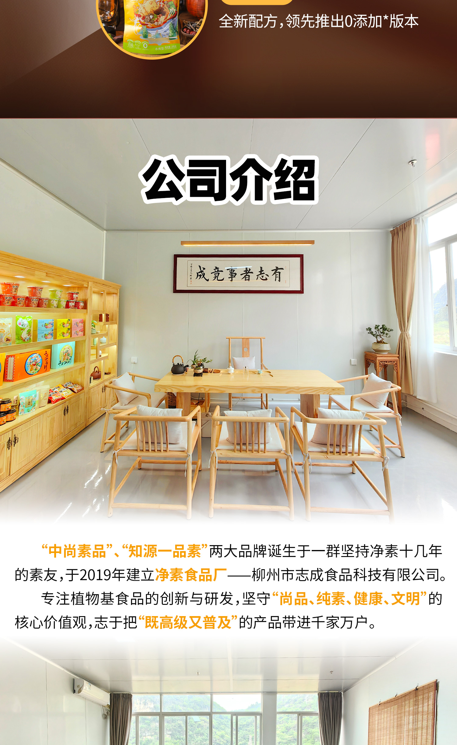 十几年前,我们团队因吃素相聚,之后一起做素食健康食品,为健康环保事业,贡献自己的一点点力量。2015年成立中尚公司,推出“中尚素品”和“知源一品素”系列产品,2019年建立自营的素食食品工厂(柳州市志成食品科技有限公司),专注于方便食品、糕点月饼、糖果、调味品和豆制品的研发、生产,生产食品标准,0动物成分,0蛋奶,0五辛,0酒精,现在正在逐步实现0防腐剂。