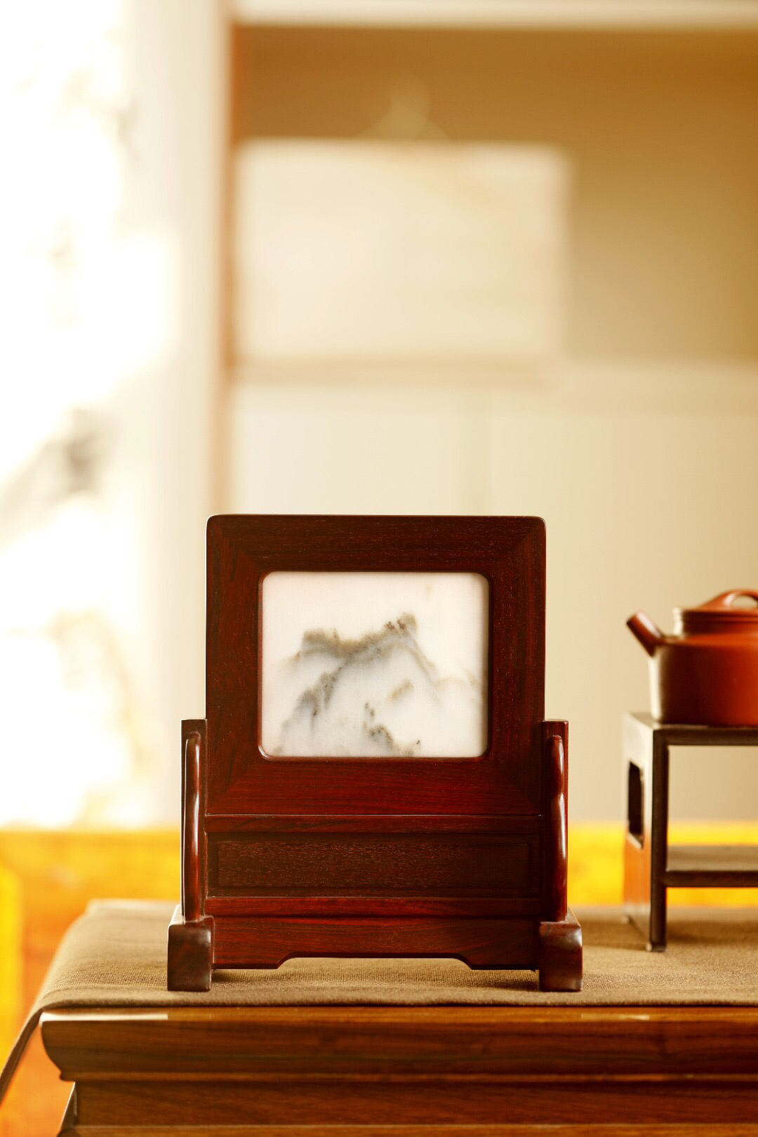 榫卯攒镶云石屏心,若云涌空山,灵动静谧;