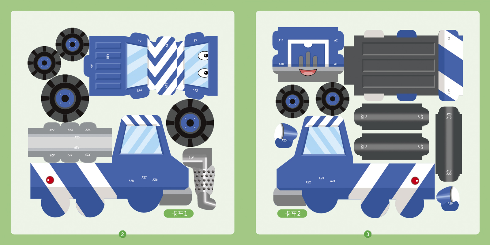 新颖性:采用白卡纸多层对裱设计,抠下手工部分,可以制作成独立的立体汽车,车型多样、消防车、救护车、跑车、吊车……夹层部分是完整的汽车救援故事。