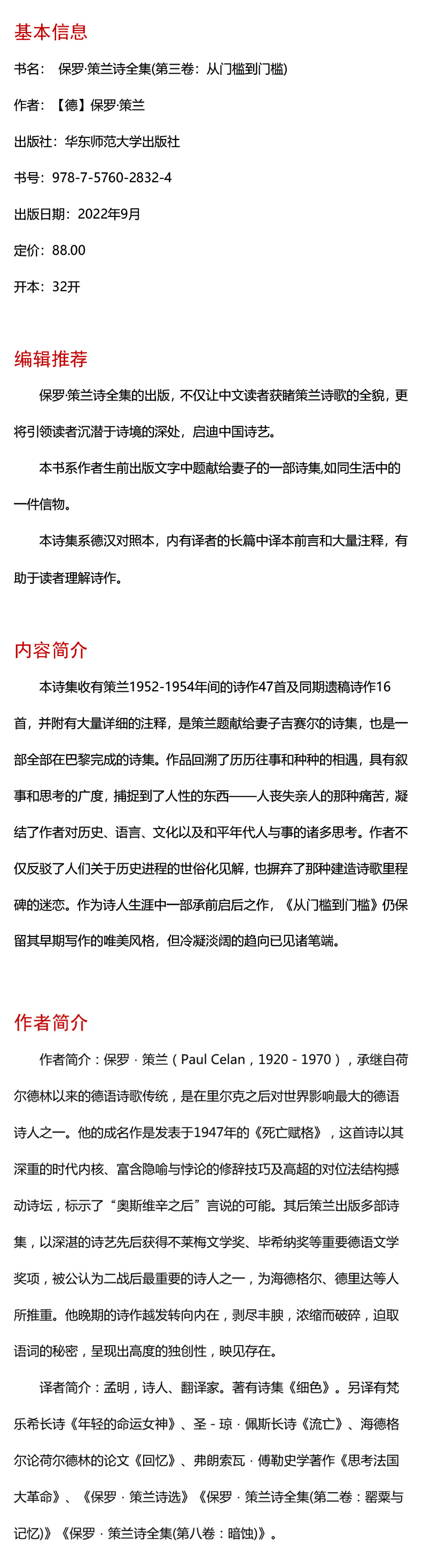 保罗 策兰诗全集 第三卷 从门槛到门槛 德汉对照本 诗集