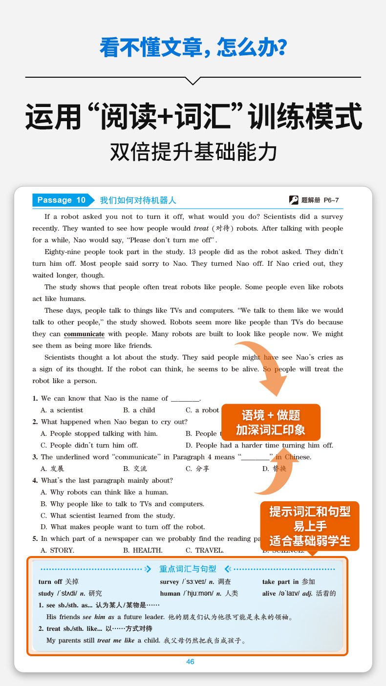 6. 精选20篇时文,改编成初中难度的文本,标出重点词汇及释义,提供全文翻译,基础弱的学生也能看懂;