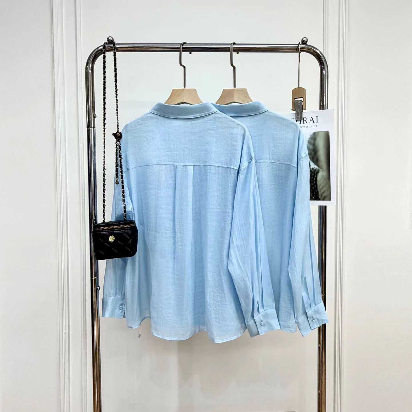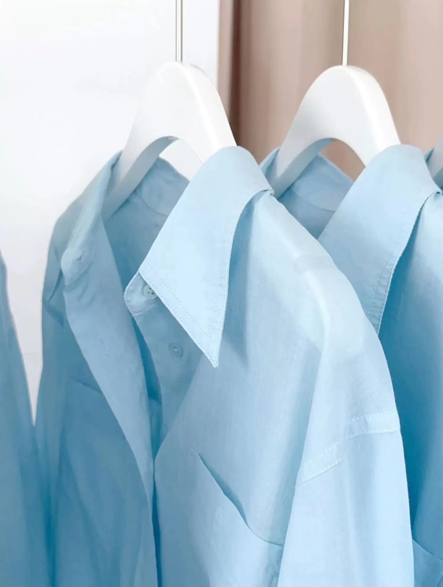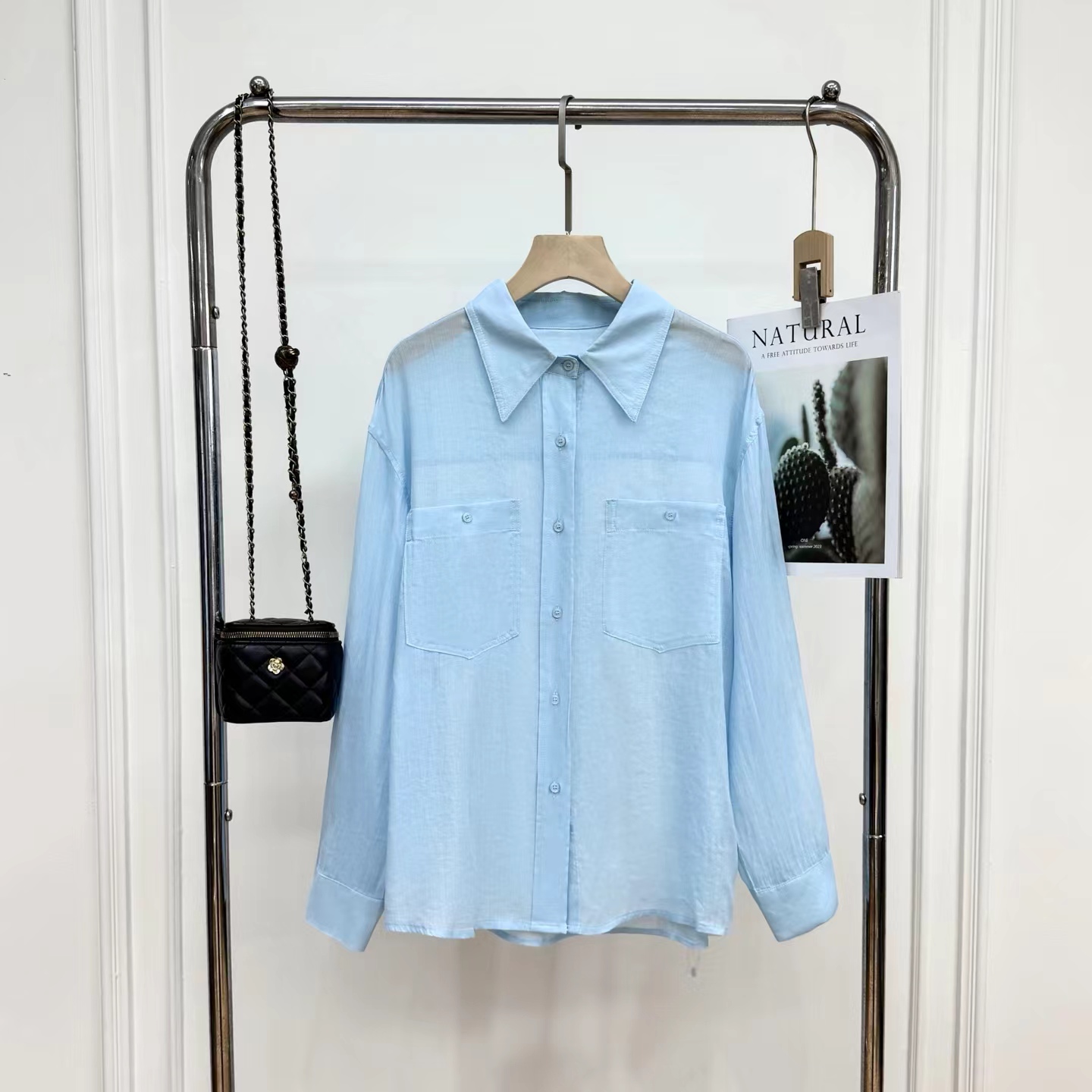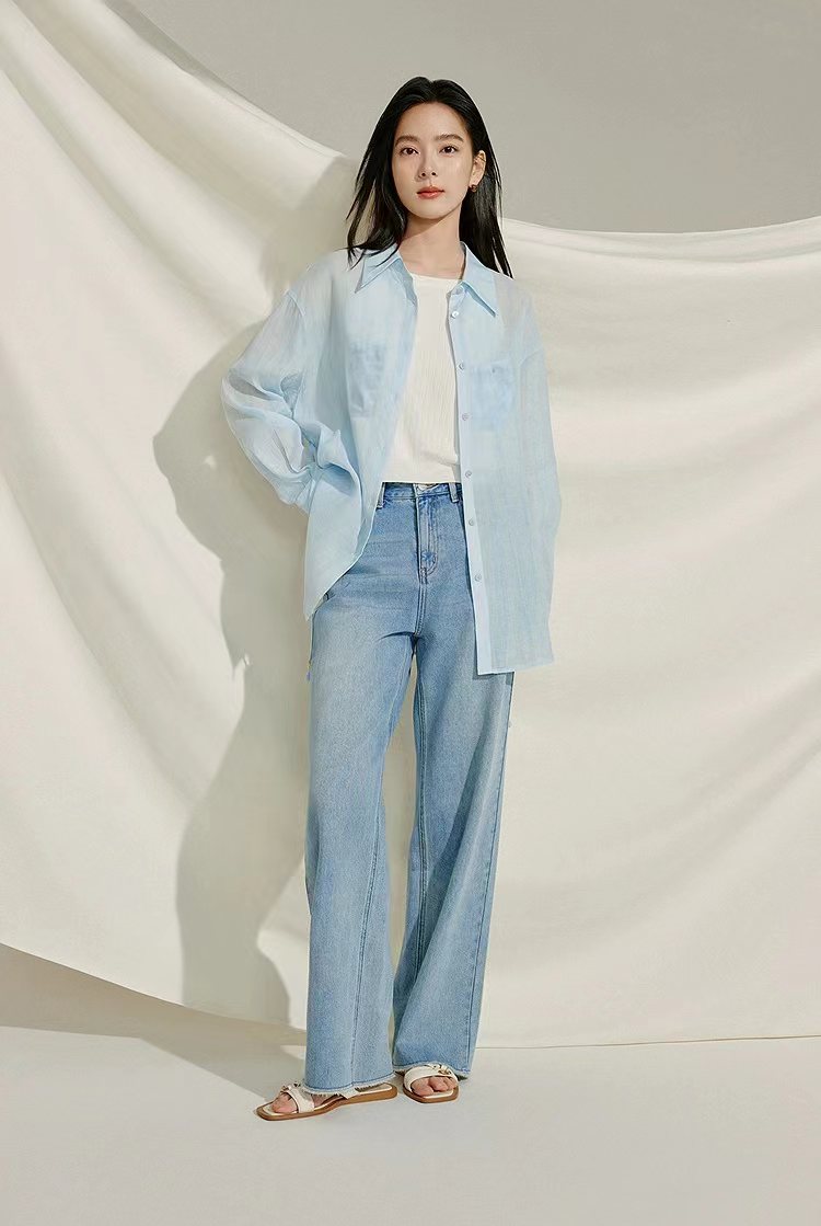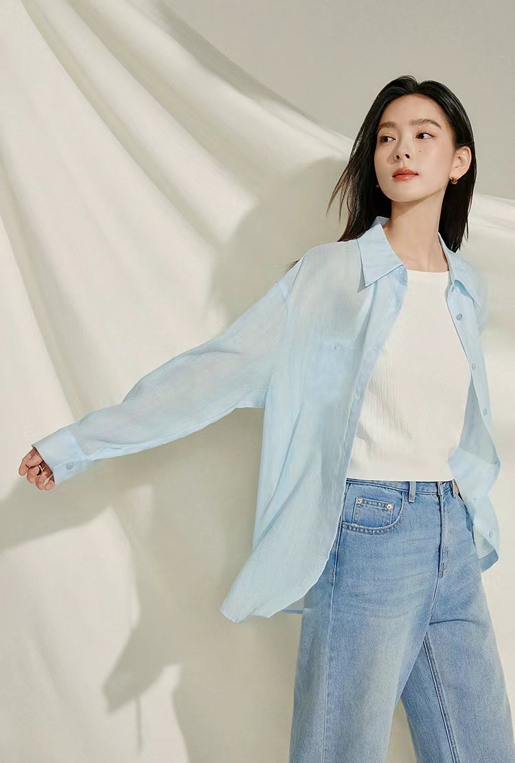 薄荷Baby蓝~春夏新款苎麻棉宽松排扣防晒衬衫夏日清凉担当!轻薄通透苎麻薄荷Baby蓝衬衫!如初夏湖水,显白清新明净,透着淡淡的温柔。采用苎麻+棉材质,轻盈如蝉翼,肌理间透着天然的呼吸感,透气性好,仿若给肌肤披上一层透气面纱,阻隔紫外线的同时,又毫无闷热之感!是夏日衣橱里优质之选。宽松版型,整体轮廓随性大气。jing典的翻领设计,简洁利落,增添了几分正式感!胸前设有双口袋,与衬衫整体风格相得益彰丰富了视觉层次。同色纽扣与面料浑然一体,表面光滑细腻,扣合时顺滑无阻,于细微之处彰显jing致工艺。袖口以一粒纽扣固定,解开时可随性翻折,为手臂活动提供更多空间,展现出随性不羁的时尚态度。也可根据需求自由挽起,带来不同风格的穿搭效果。衣长适中,下摆自然垂坠,能轻松遮盖臀部,既可以选择将下摆掖进裤腰,打造利落干练的造型,也可以任其自由垂下,营造慵懒松弛的氛围感。