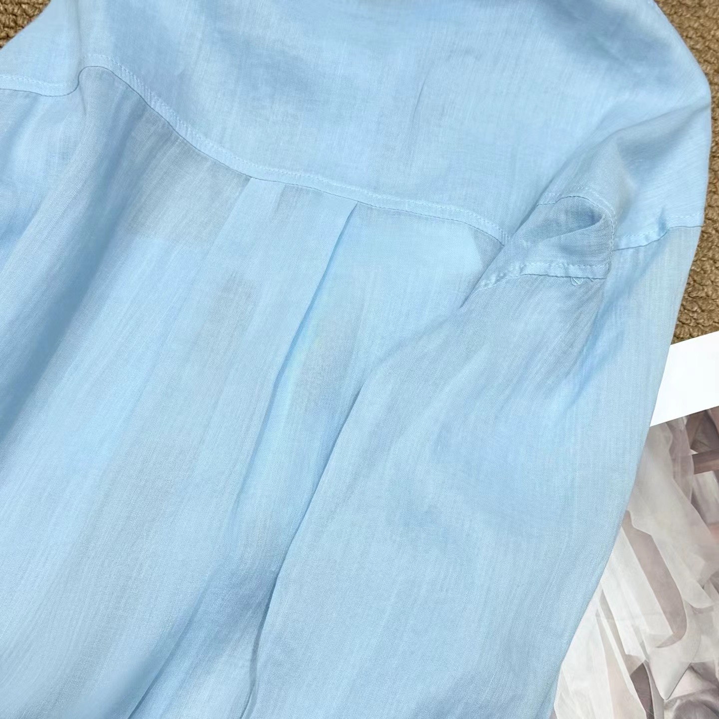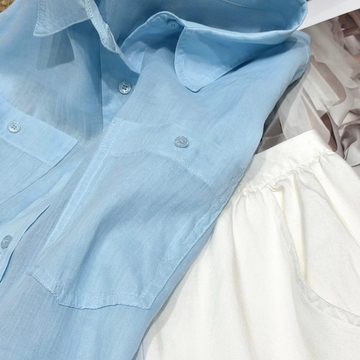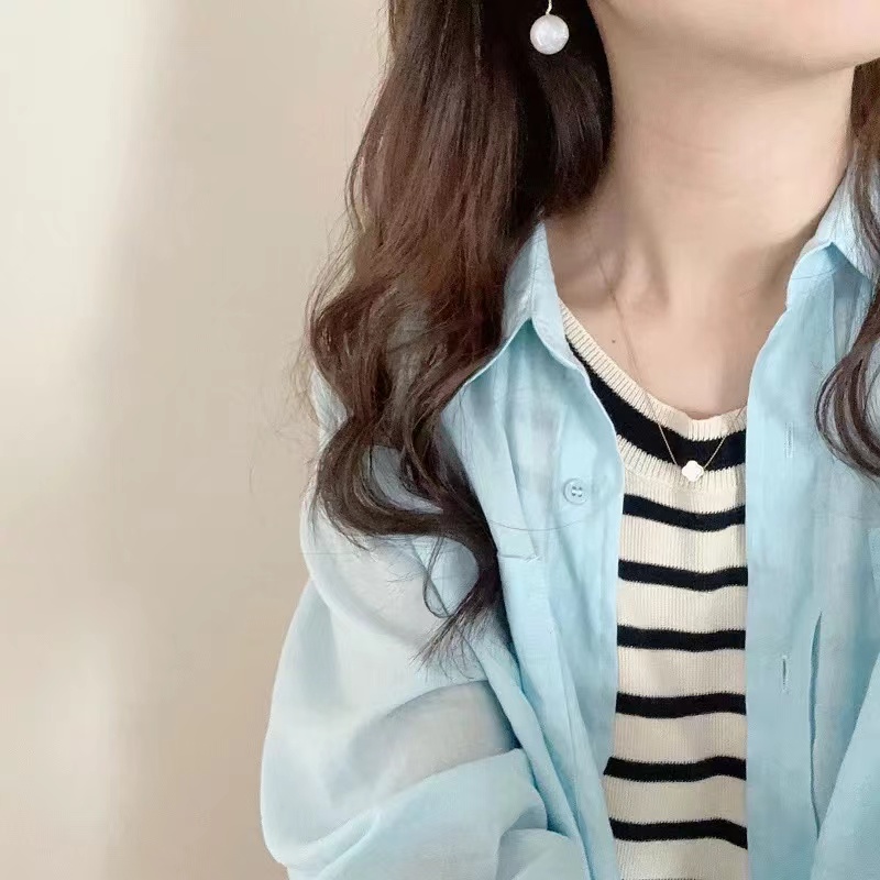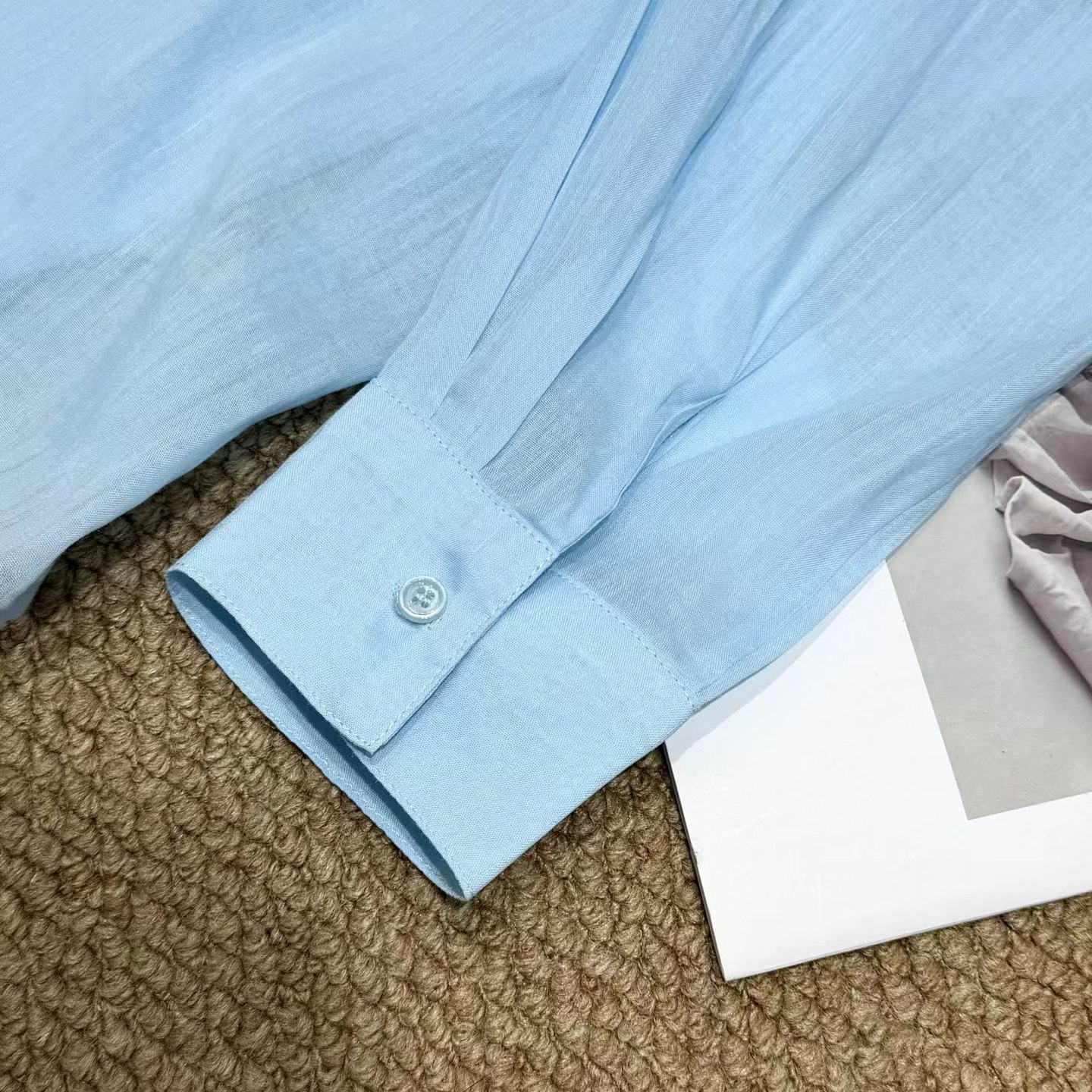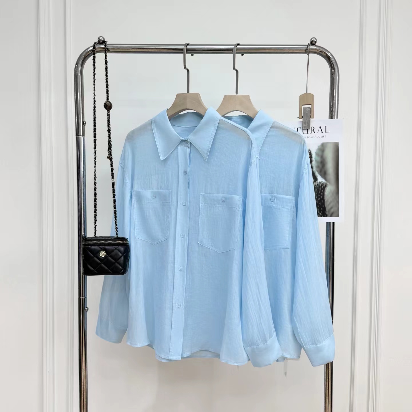 薄荷Baby蓝~春夏新款苎麻棉宽松排扣防晒衬衫夏日清凉担当!轻薄通透苎麻薄荷Baby蓝衬衫!如初夏湖水,显白清新明净,透着淡淡的温柔。采用苎麻+棉材质,轻盈如蝉翼,肌理间透着天然的呼吸感,透气性好,仿若给肌肤披上一层透气面纱,阻隔紫外线的同时,又毫无闷热之感!是夏日衣橱里优质之选。宽松版型,整体轮廓随性大气。jing典的翻领设计,简洁利落,增添了几分正式感!胸前设有双口袋,与衬衫整体风格相得益彰丰富了视觉层次。同色纽扣与面料浑然一体,表面光滑细腻,扣合时顺滑无阻,于细微之处彰显jing致工艺。袖口以一粒纽扣固定,解开时可随性翻折,为手臂活动提供更多空间,展现出随性不羁的时尚态度。也可根据需求自由挽起,带来不同风格的穿搭效果。衣长适中,下摆自然垂坠,能轻松遮盖臀部,既可以选择将下摆掖进裤腰,打造利落干练的造型,也可以任其自由垂下,营造慵懒松弛的氛围感。