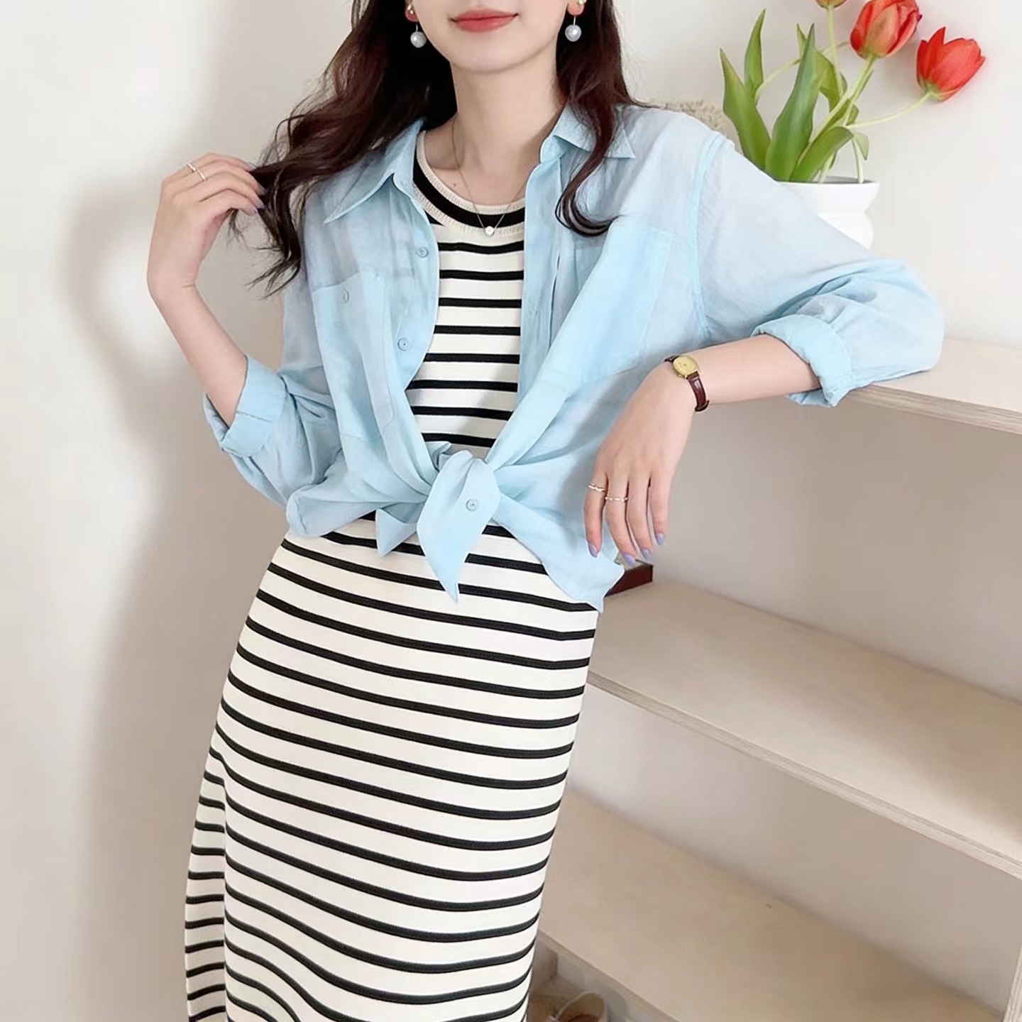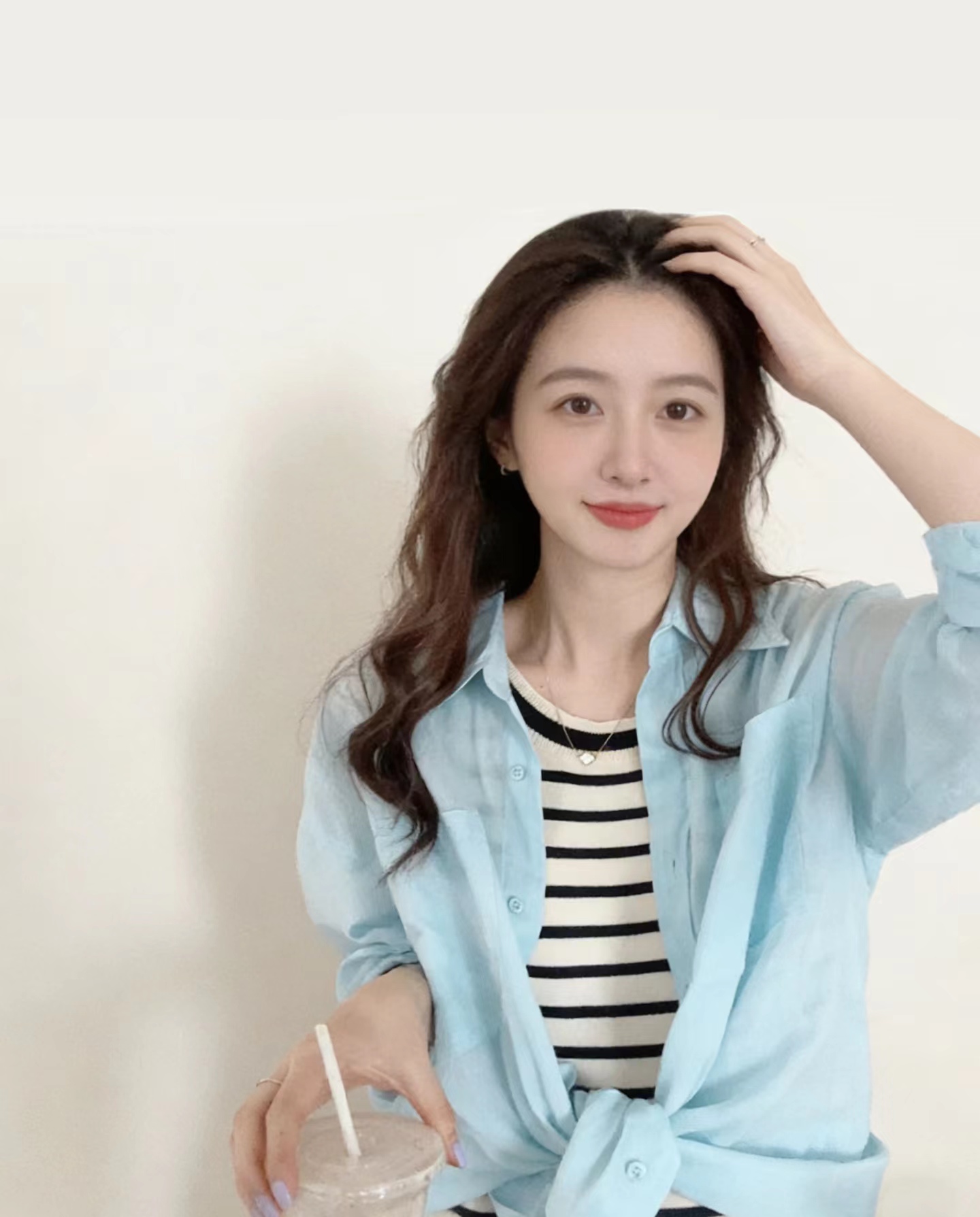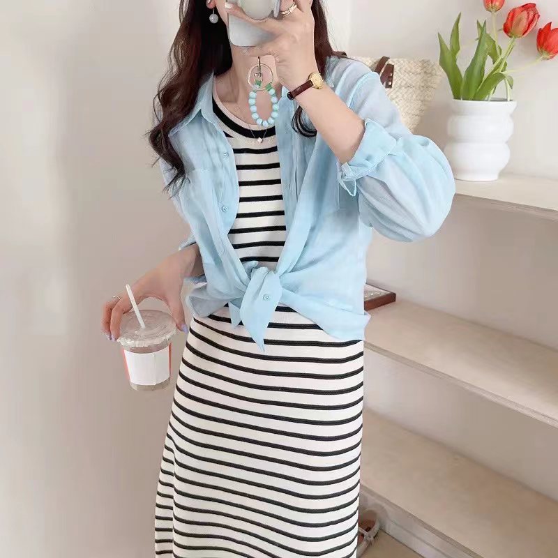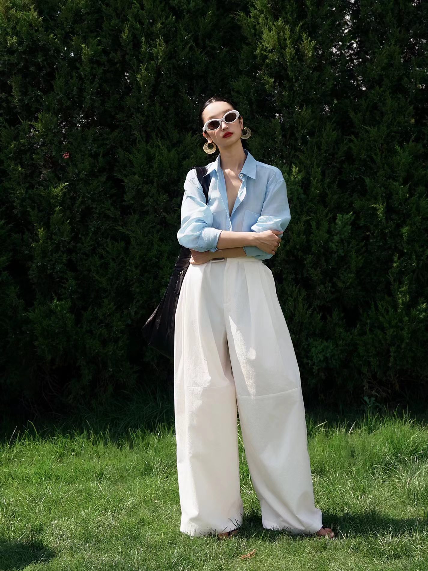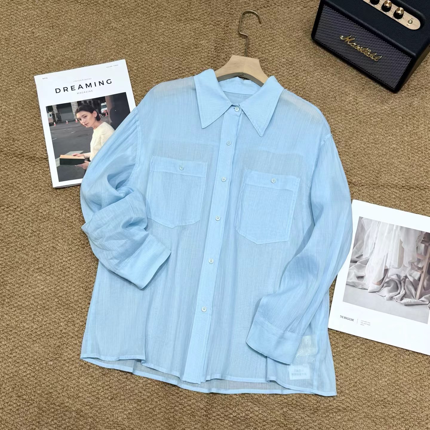 薄荷Baby蓝~春夏新款苎麻棉宽松排扣防晒衬衫夏日清凉担当!轻薄通透苎麻薄荷Baby蓝衬衫!如初夏湖水,显白清新明净,透着淡淡的温柔。采用苎麻+棉材质,轻盈如蝉翼,肌理间透着天然的呼吸感,透气性好,仿若给肌肤披上一层透气面纱,阻隔紫外线的同时,又毫无闷热之感!是夏日衣橱里优质之选。宽松版型,整体轮廓随性大气。jing典的翻领设计,简洁利落,增添了几分正式感!胸前设有双口袋,与衬衫整体风格相得益彰丰富了视觉层次。同色纽扣与面料浑然一体,表面光滑细腻,扣合时顺滑无阻,于细微之处彰显jing致工艺。袖口以一粒纽扣固定,解开时可随性翻折,为手臂活动提供更多空间,展现出随性不羁的时尚态度。也可根据需求自由挽起,带来不同风格的穿搭效果。衣长适中,下摆自然垂坠,能轻松遮盖臀部,既可以选择将下摆掖进裤腰,打造利落干练的造型,也可以任其自由垂下,营造慵懒松弛的氛围感。