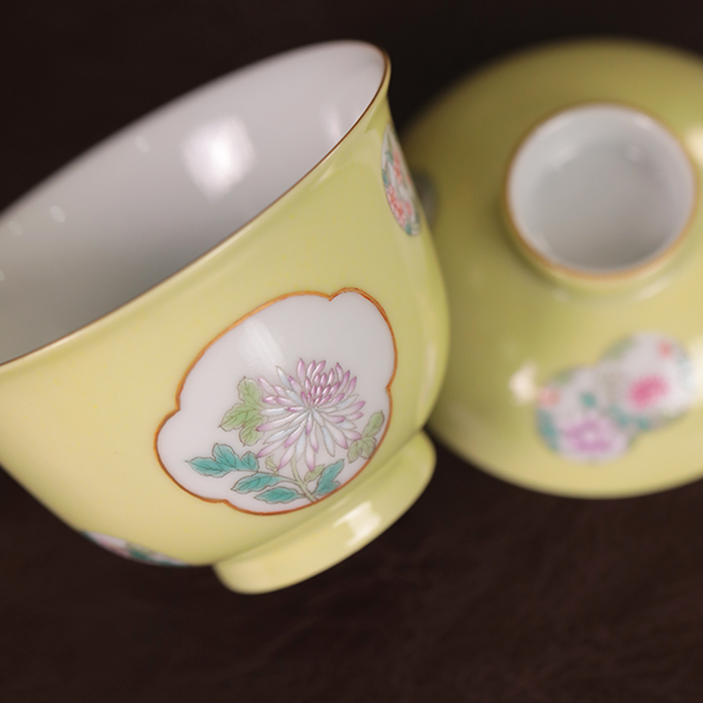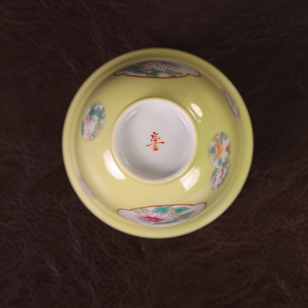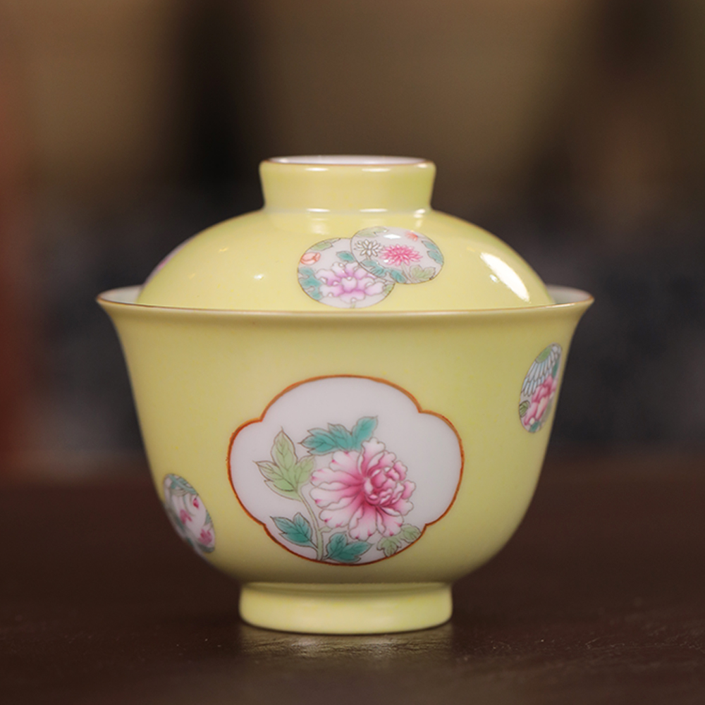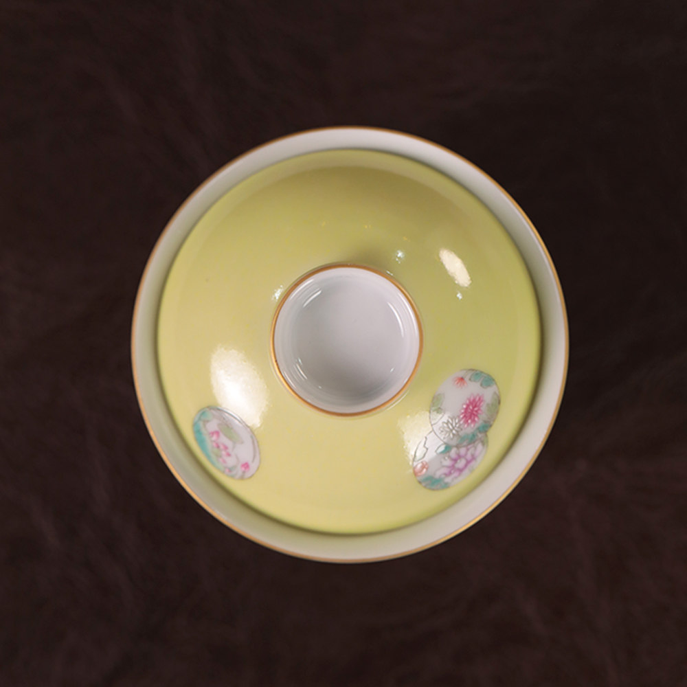 【忘言】柠檬黄地小团花茶碗盖碗 曰何文人器