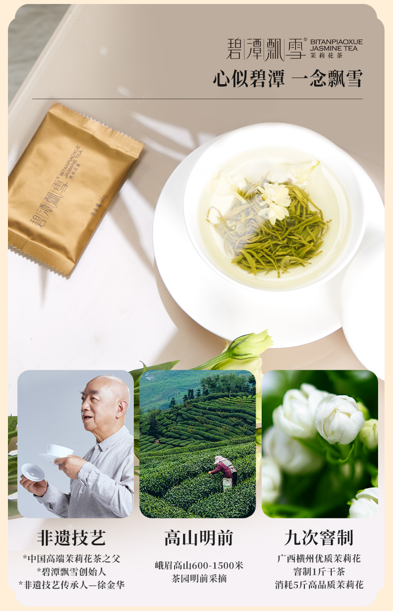 中国制茶大师徐金华(徐公)传承 古方制作技艺 开创新派茉莉花茶 精选峨眉高山明前春茶 配以广西横县双瓣茉莉 花与茶,黄金配比 时间酝酿,层层历练 花香与茶香交融 盖碗之间 仿佛茉莉花在舌尖绽放