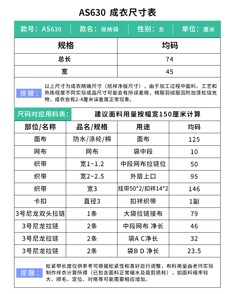 裁缝学苑AS630必备神器旅行收纳袋纸样女装衣物整理包行李箱收纳样板