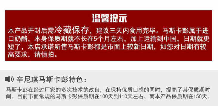 温馨小提示:开封后请尽量于3天内食用完毕,或者无菌分装成多份密封冷藏,不要冷冻哦,会变奶渣渣。由于马斯卡彭为进口奶酪,运输报关等需要一定的时效,且马斯卡彭不含防腐剂保质期仅为5个月,运送到手后最佳赏味期限或较有限,但承诺都是较新的日期,一旦拍下无法更改地址或拒收,介意慎拍。