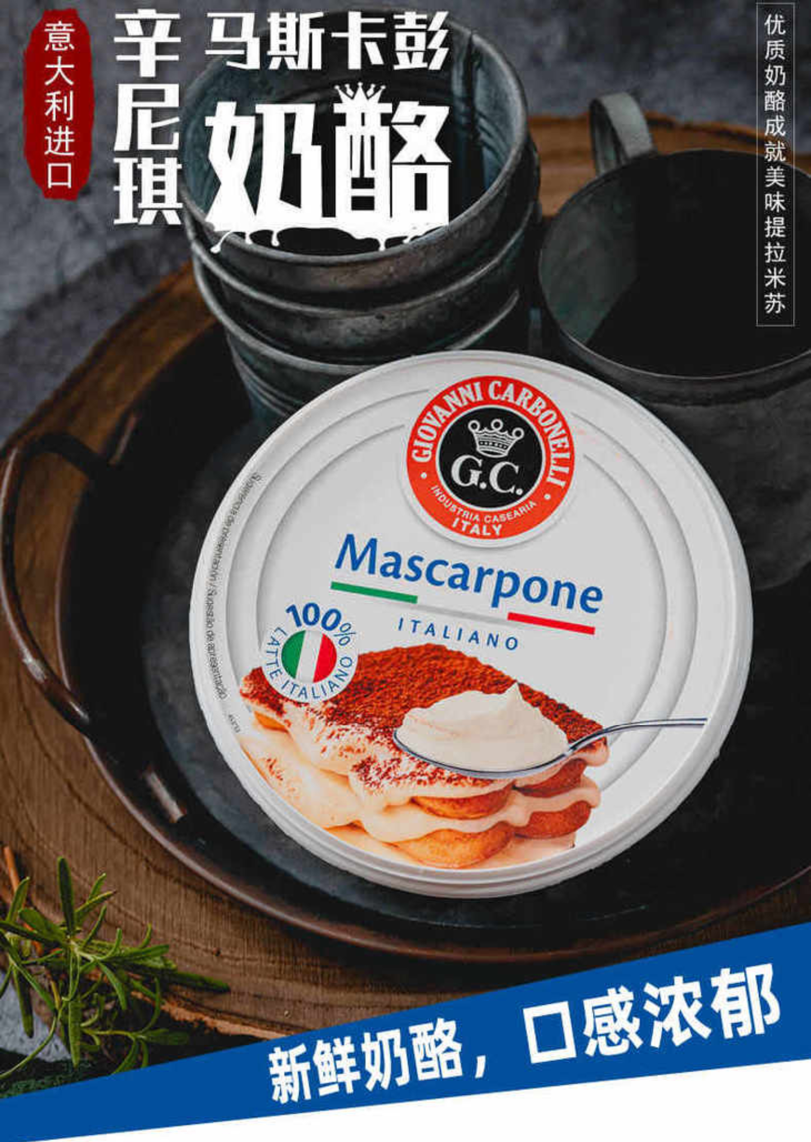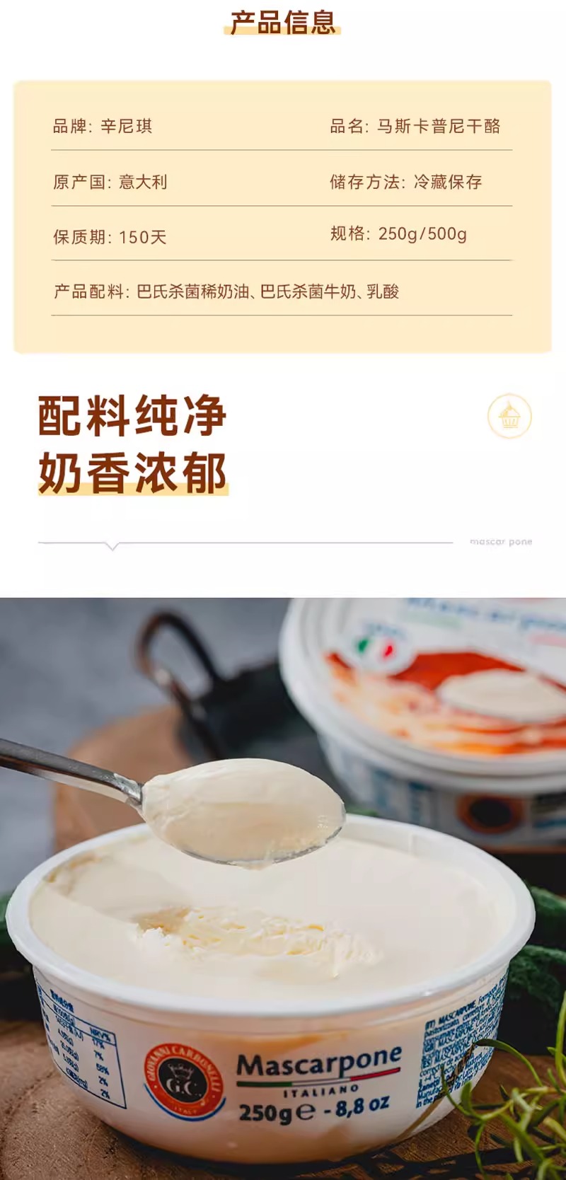 马斯卡彭是来自意大利伦巴第地区的特色奶酪,辛尼琪的马斯卡彭是用柠檬酸、醋酸或酒石酸使新鲜牛奶凝结,继而取出部分水分后所形成的"新鲜奶酪",软硬程度介于鲜奶油与奶油乳酪cream cheese之间,带有轻微的甜味及浓郁的口感。从真正意义上来说,它属于凝结奶油,而非传统意义上的奶酪。因为没有经过发酵也没有其它防腐剂的添加,所以马斯卡彭保质期短,但吃起来也更是健康。