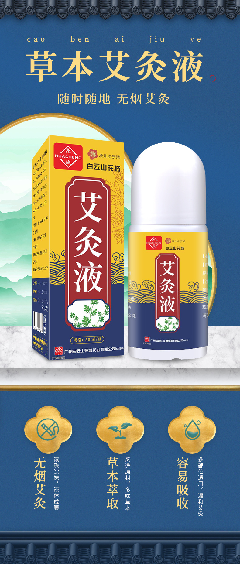 【白云山花城!艾灸液】液体成膜,滚珠涂抹,草本萃取,无烟艾灸!艾草滚珠透骨液艾绒自发热按摩关节艾灸液