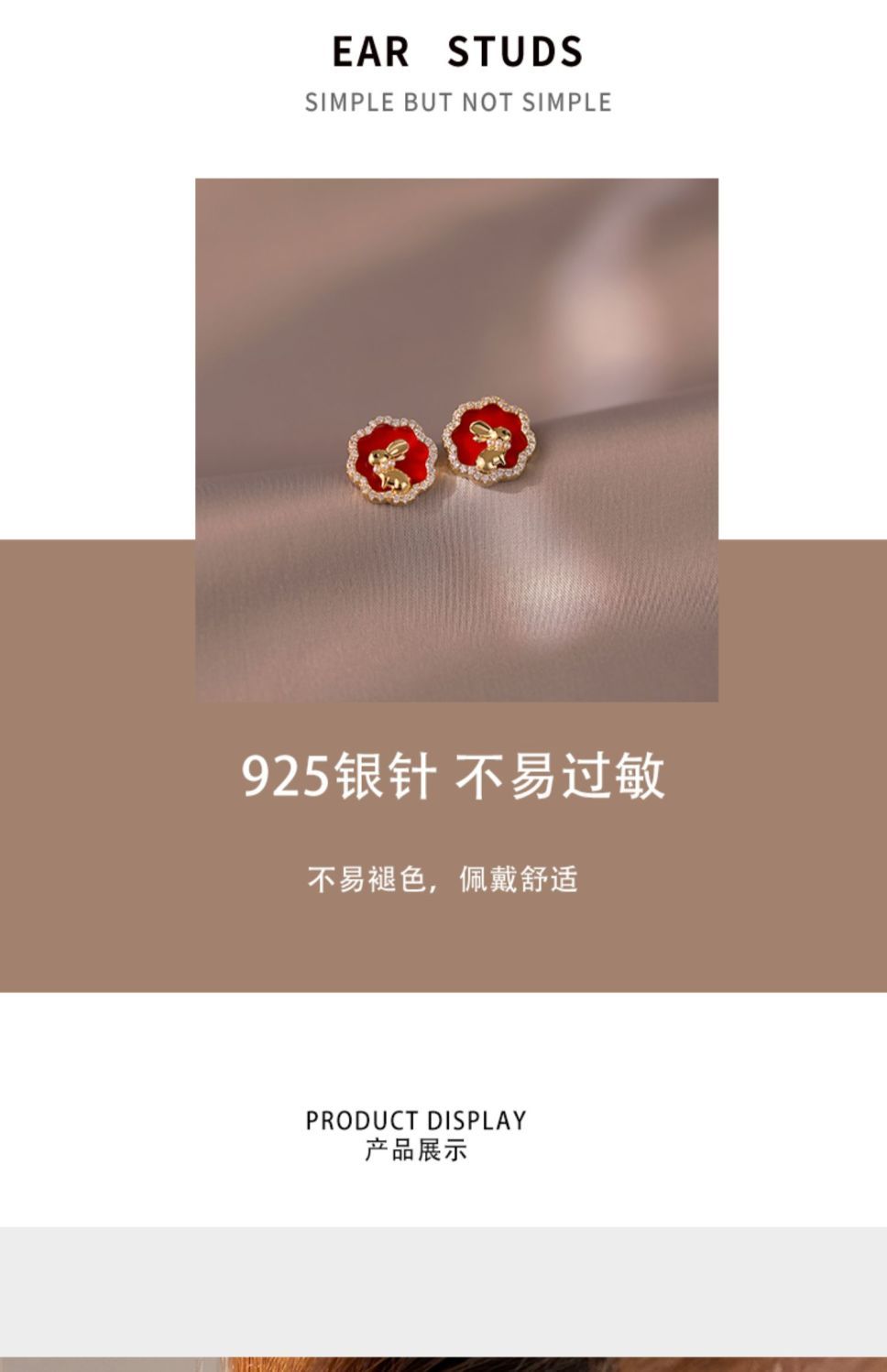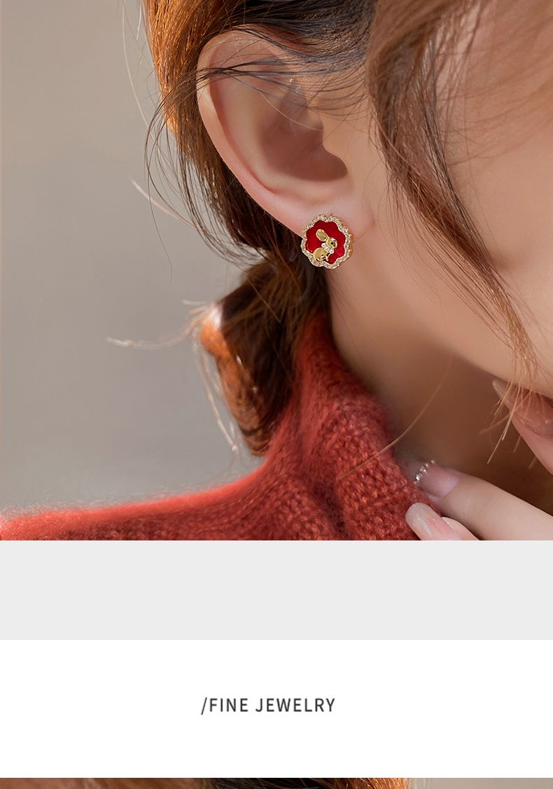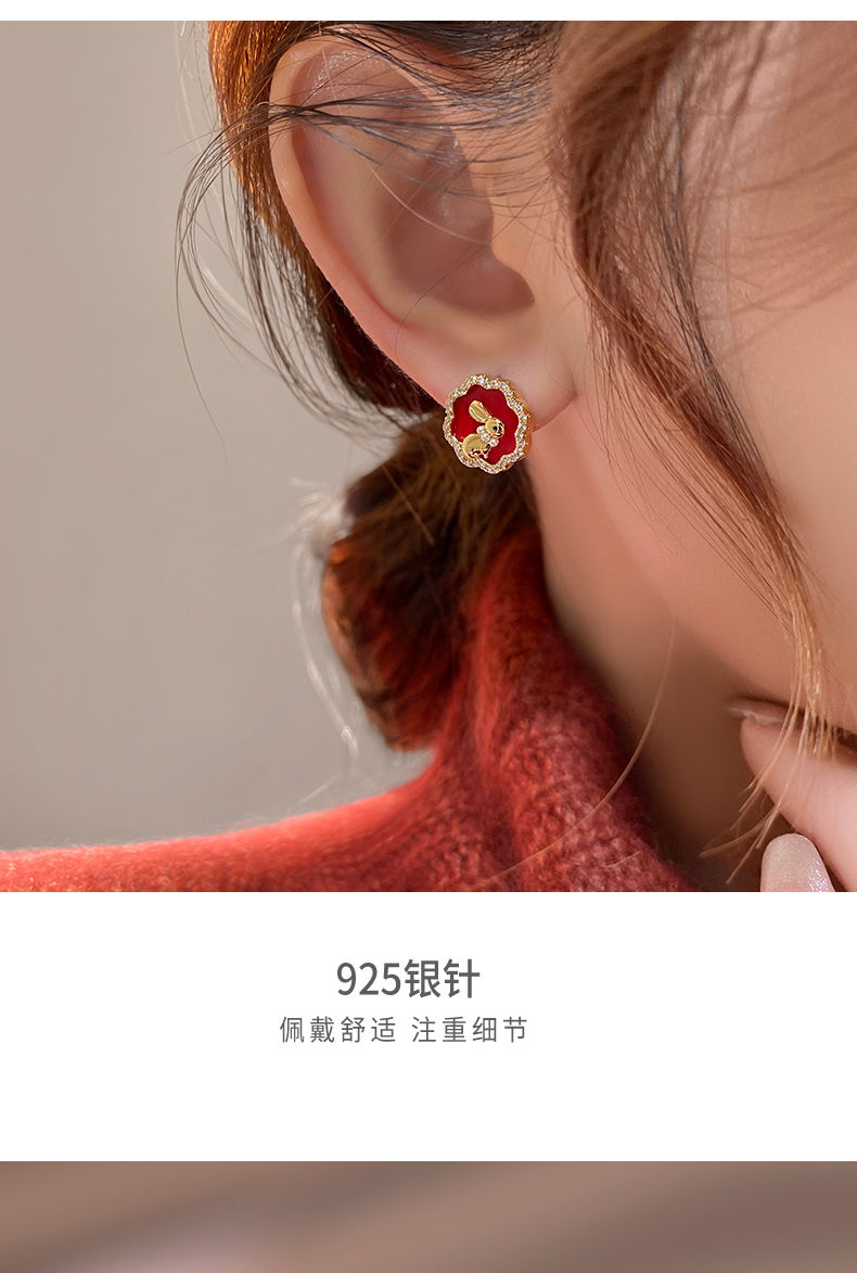 【钱兔无量】925银针小兔子耳钉女独特设计感红色耳环气质温柔2022年新款耳饰