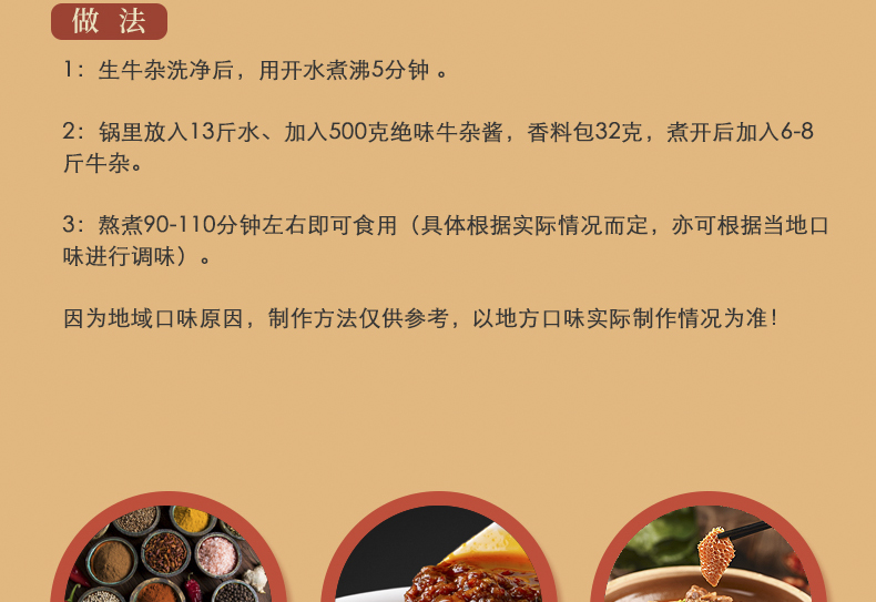 我们在传承经典的同时,把复杂的牛肉牛杂菜品用现代的烹饪手法实现标准化操作,让没有厨师经验的操作者也能把这道菜呈现到极致。我们特邀有着20年牛肉牛杂烹饪的经验的匠人合作,将20年的烹饪技艺融合成药包和酱包,再按照匠人的操作流程操作,即可实现标注化操作。