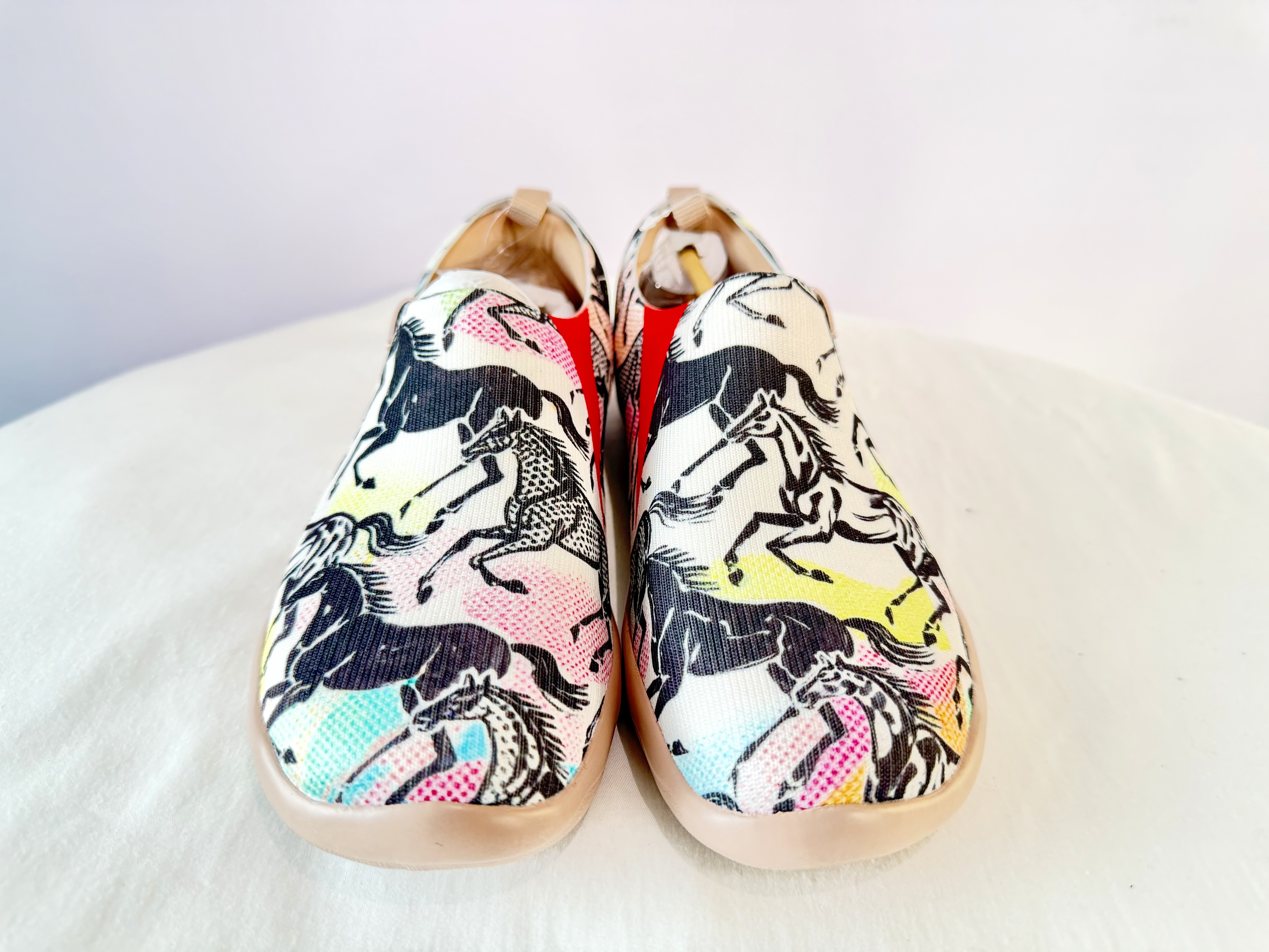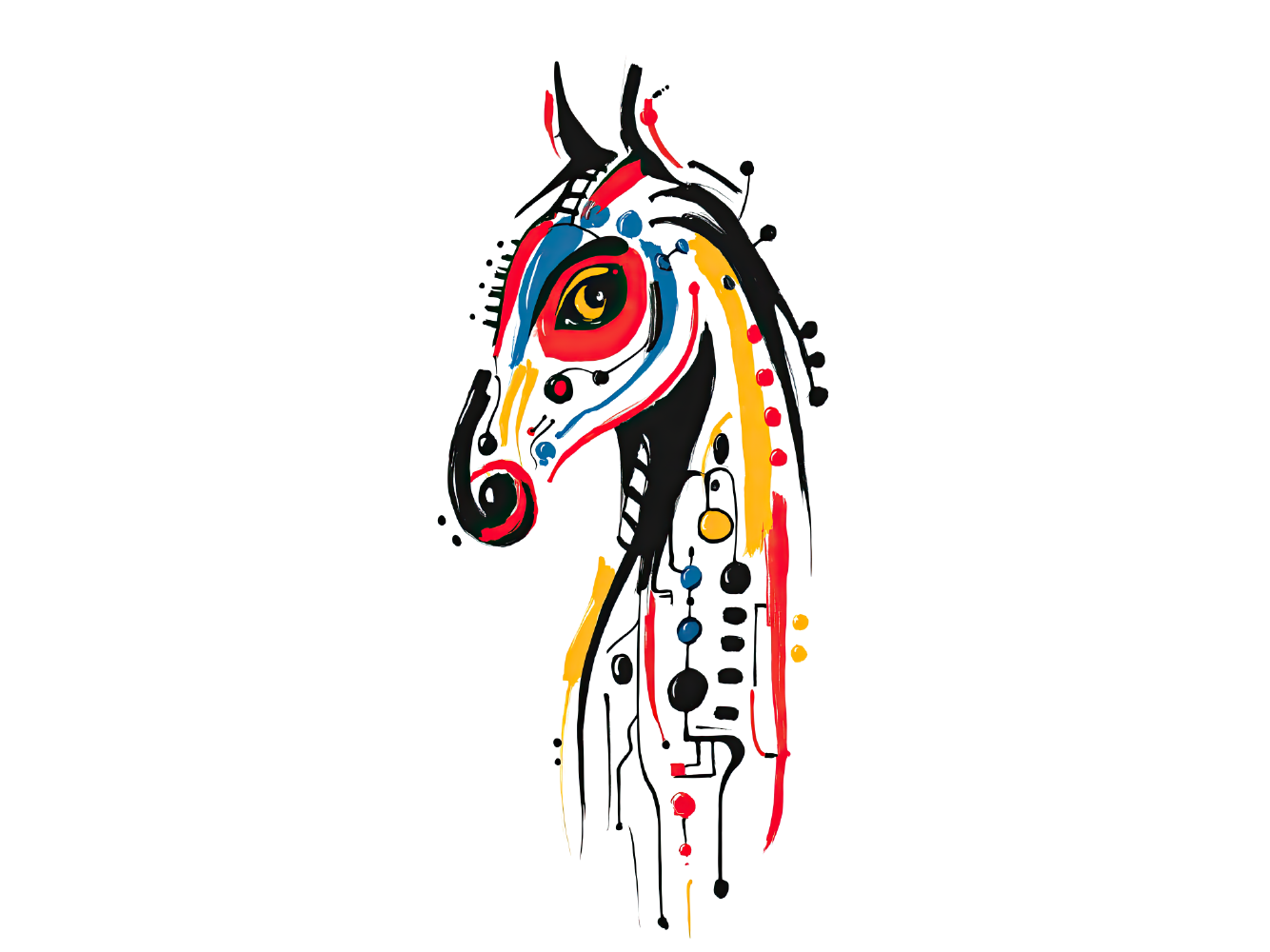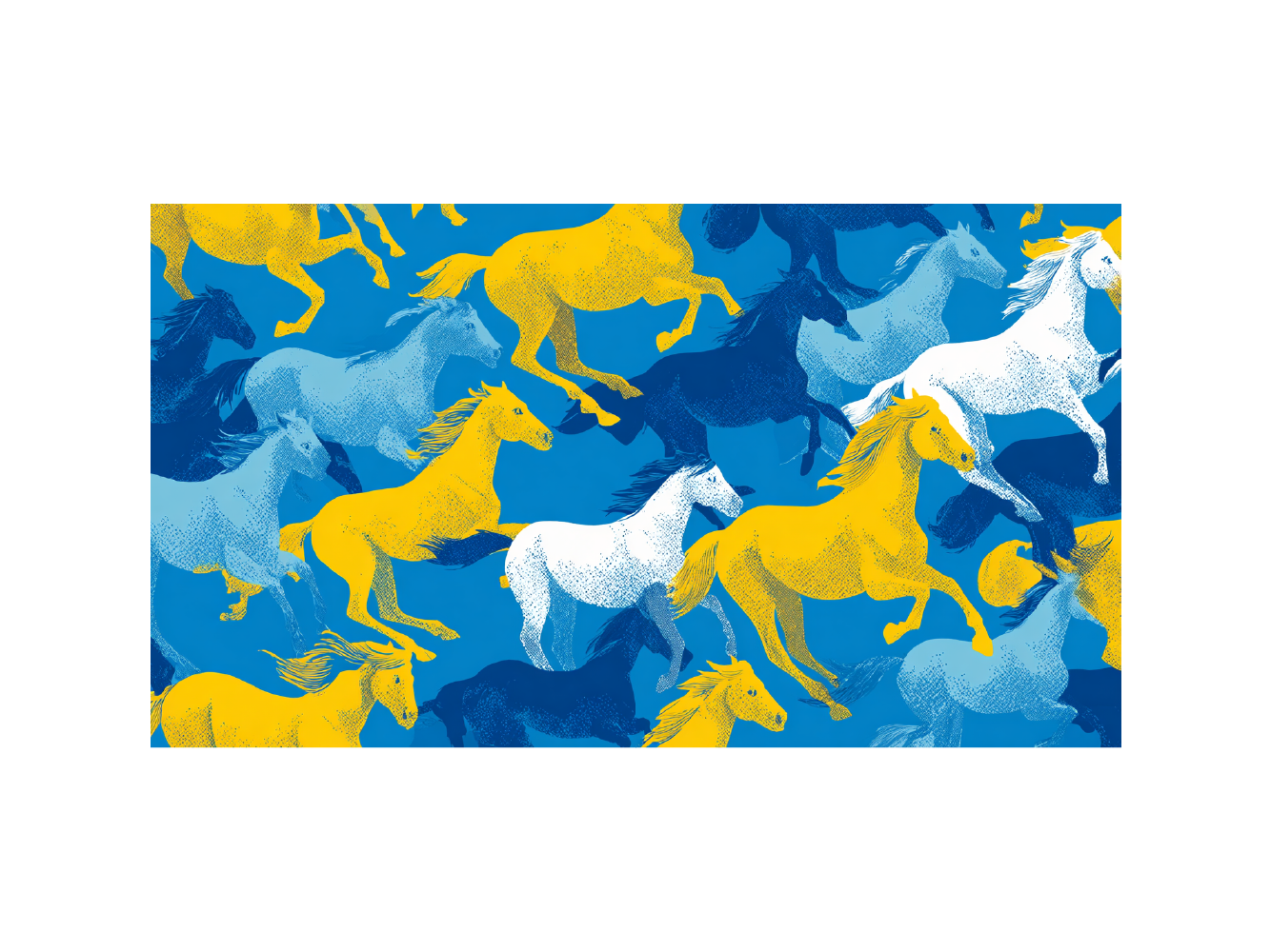 以奔马为核心意象,在艺术表达上,融合传统水墨的写意笔触与波普艺术的鲜明色彩、重复韵律。马匹姿态各异却都奔腾有力,背景色彩浓烈且富有视觉冲击,既保留了马在传统文化中自由、奋进的精神符号,又借波普风格赋予其现代艺术的活力与张力,试图在传统与现代的艺术语汇碰撞中,打造出充满动感与想象的视觉盛宴,传递出对经典意象在当代艺术语境下新生的探索。作品为AI生成。