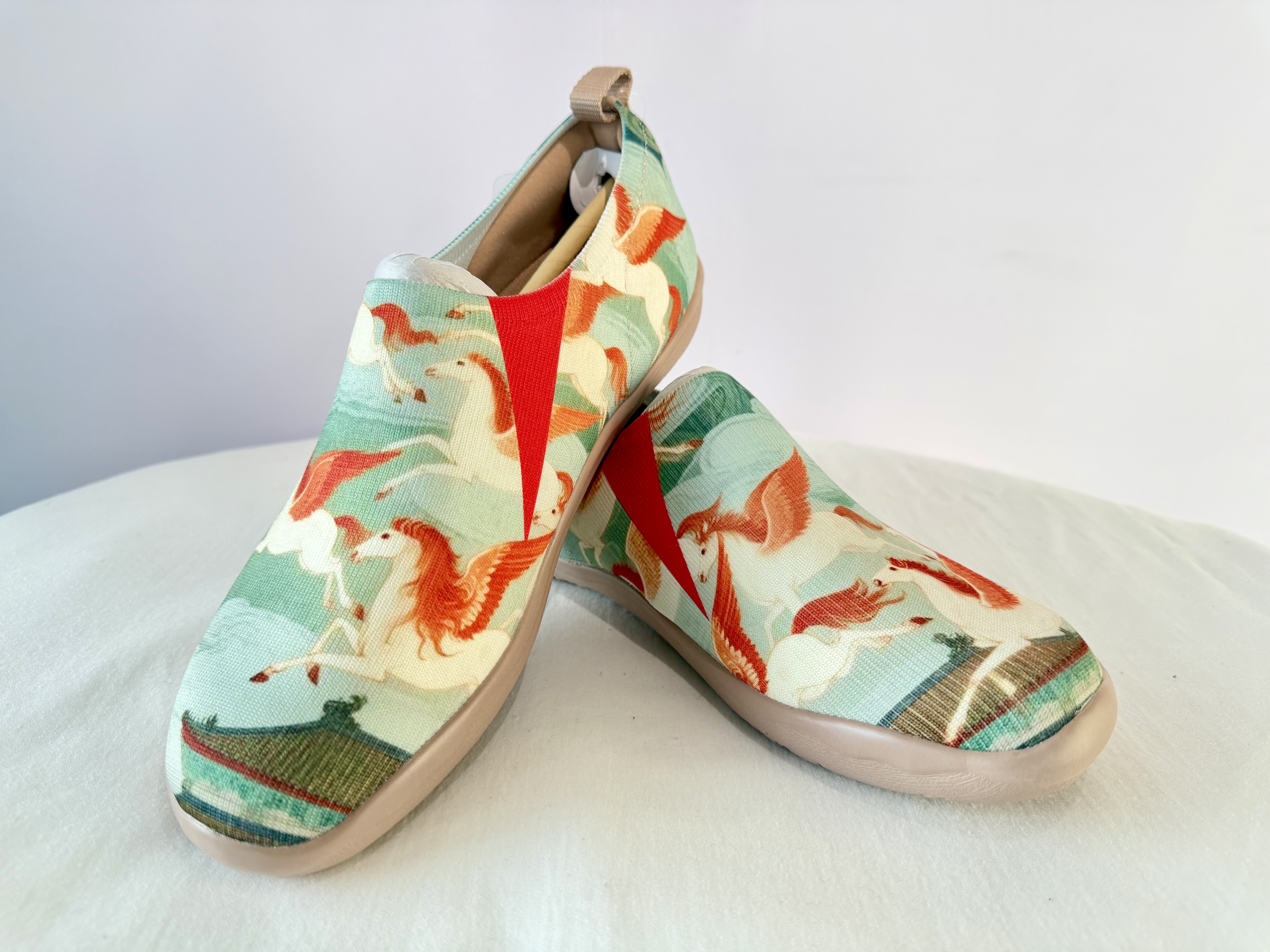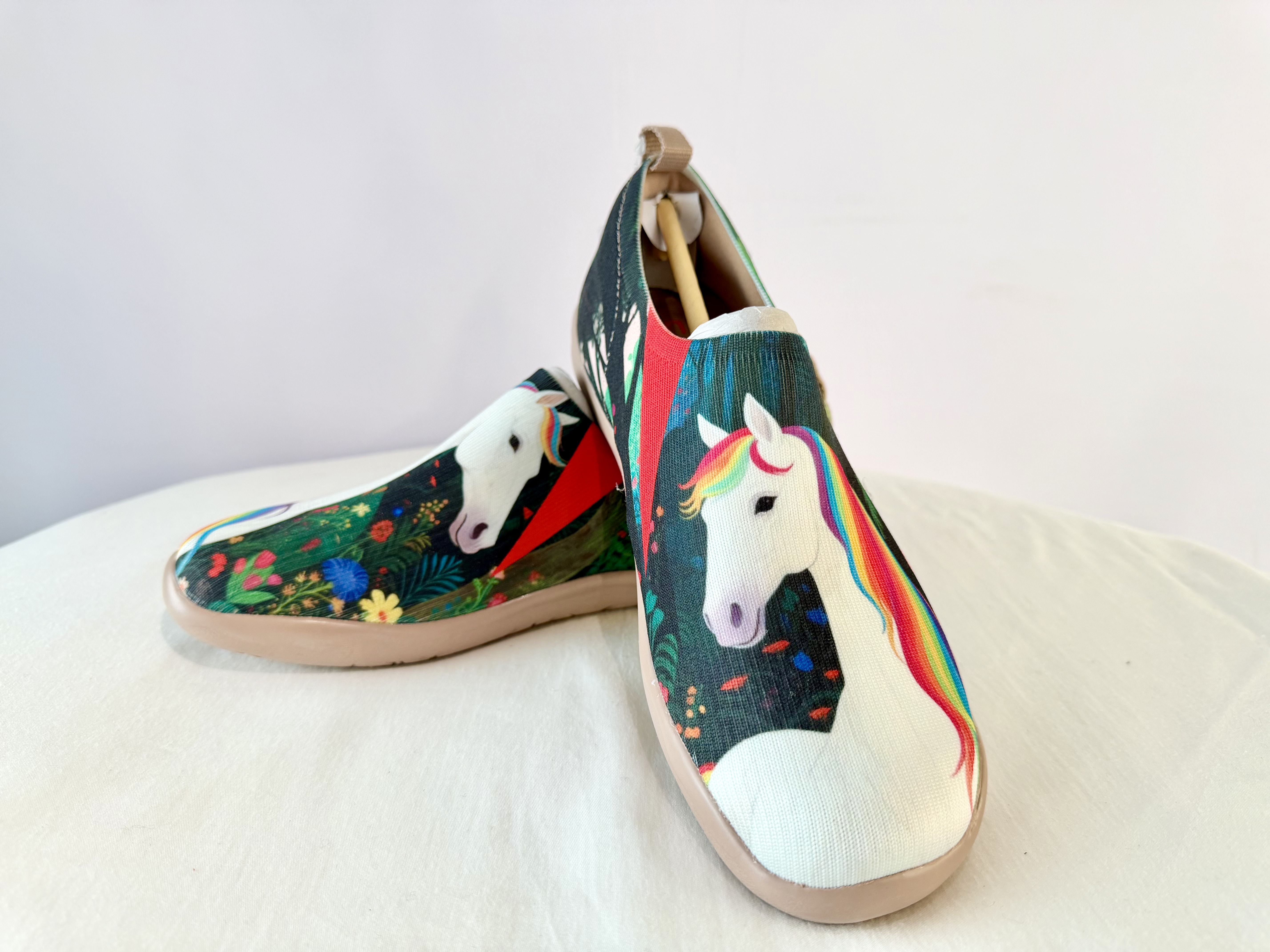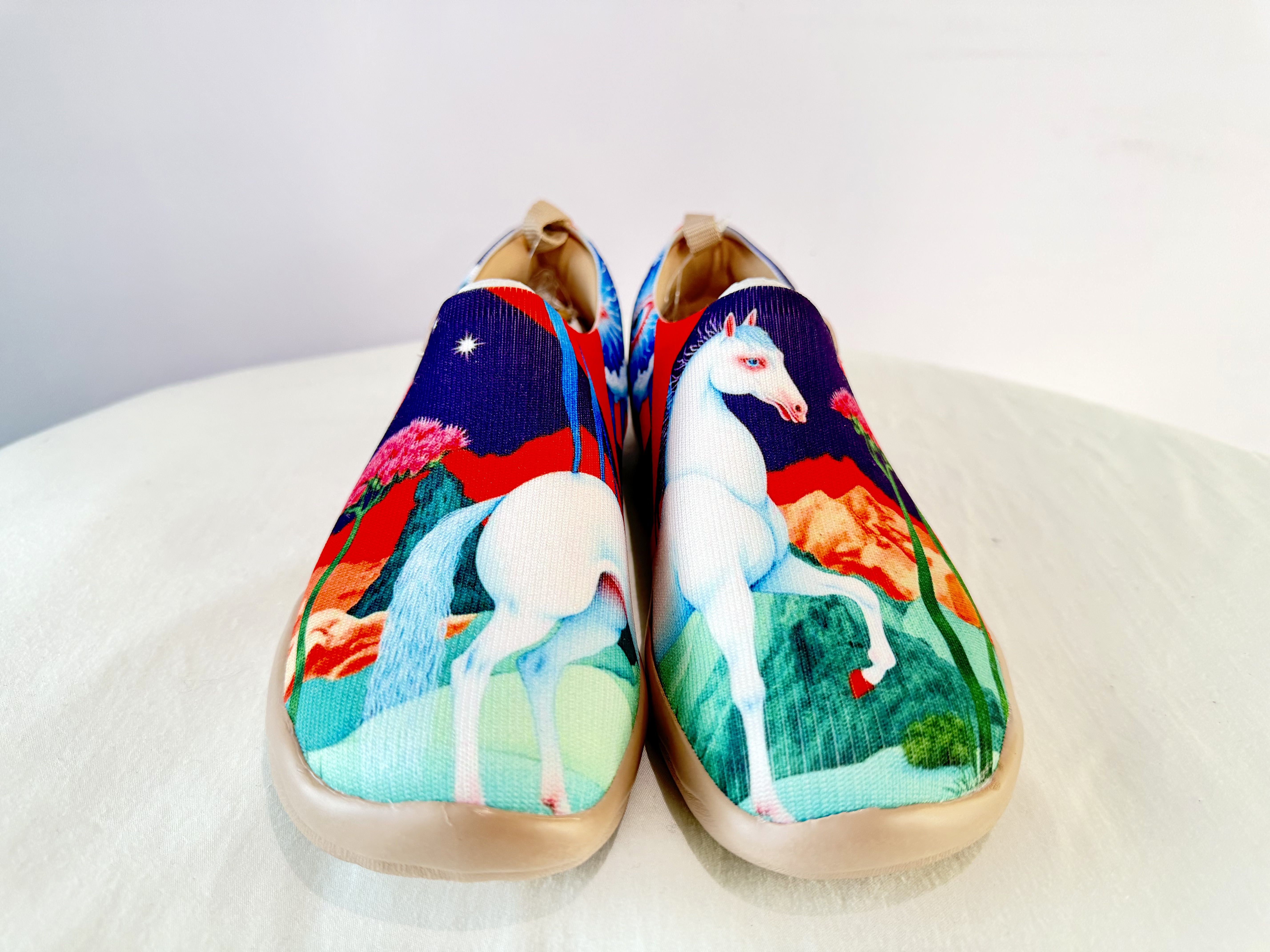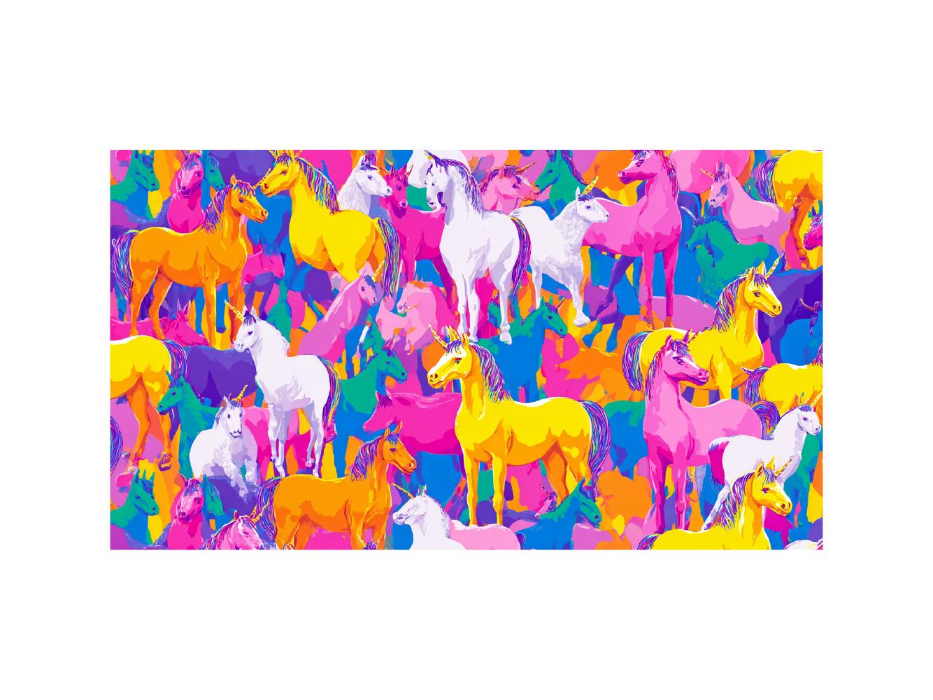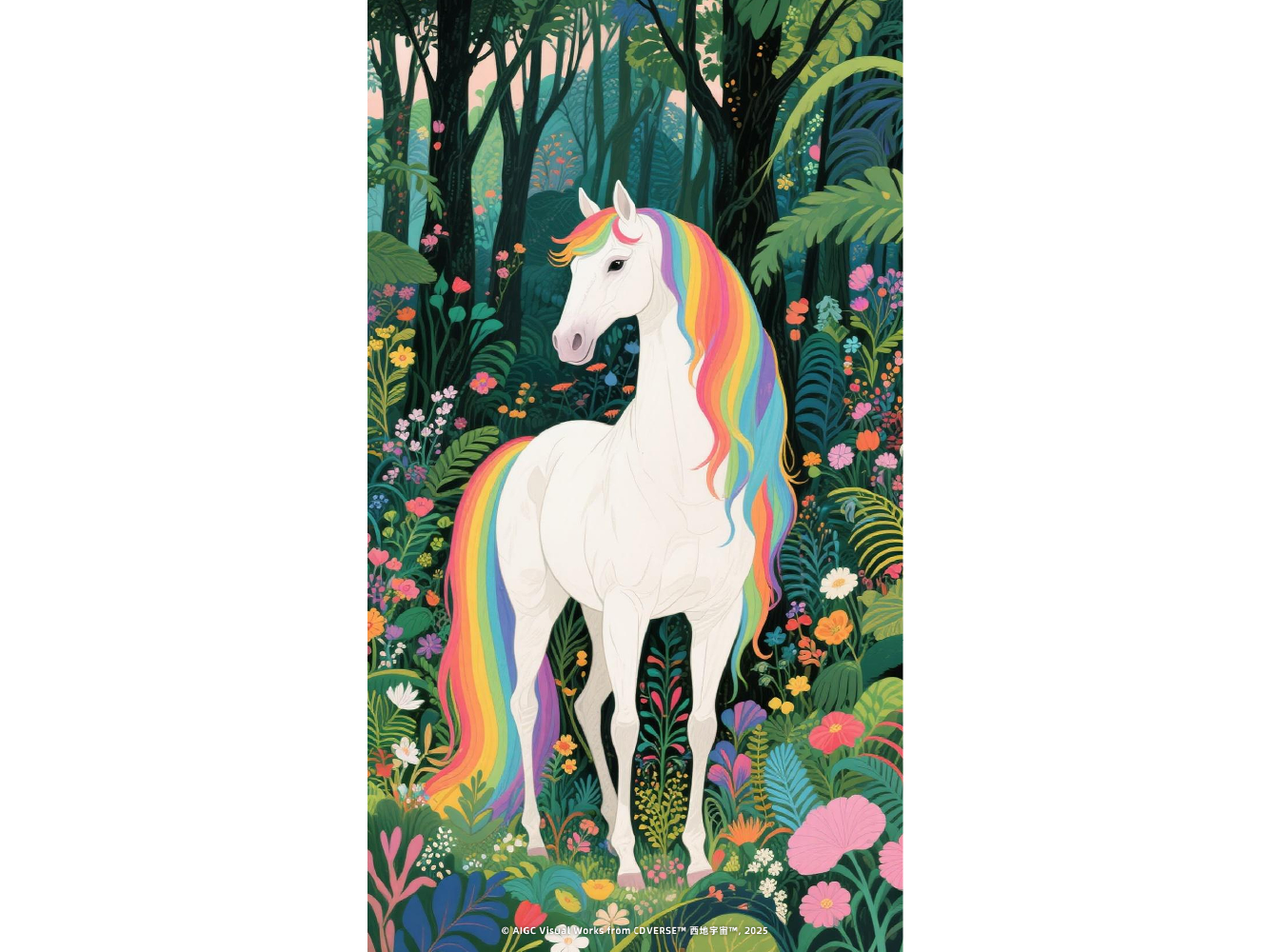 以彩虹鬃毛的白马为核心,融合中西文化意象。西方神话中独角兽象征纯洁、神秘,此处以白马结合彩虹鬃毛,既保留奇幻感,又借彩虹的绚丽传递多元与希望;东方文化里马寓意奔腾向上、吉祥奋进,二者交融打破文化边界。