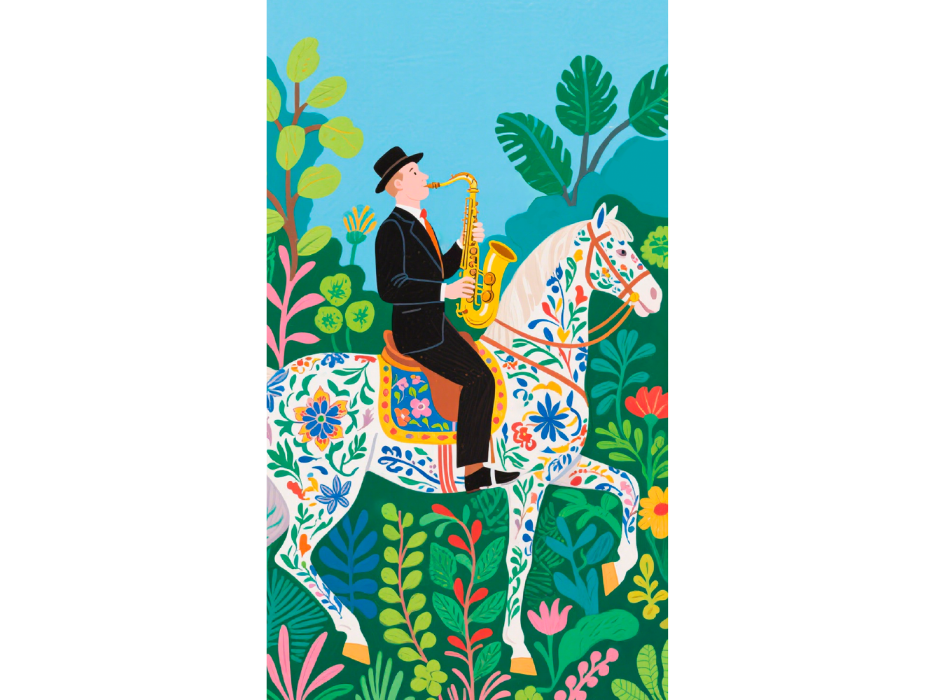 本作品呈现多元文化融合的当代视觉交响。东方元素如青花瓷、五彩瓷、苗族纹样、旗袍等,和西方雷鬼、爵士、摇滚、说唱音乐人物场景并置交融。画面中浓烈的色彩、装饰性纹样与繁茂自然背景共同构建出一个超越地域的欢腾世界,展现了文明交流中孕育的无限创造力。这组创作通过视觉与听觉的通感转化,见证了不同文化在相遇中彼此滋养,共同谱写人类情感的和谐乐章。