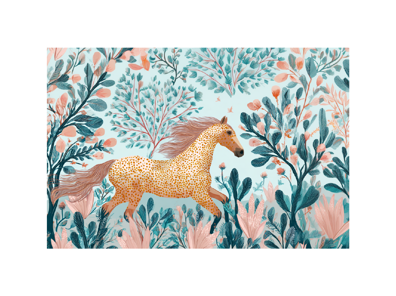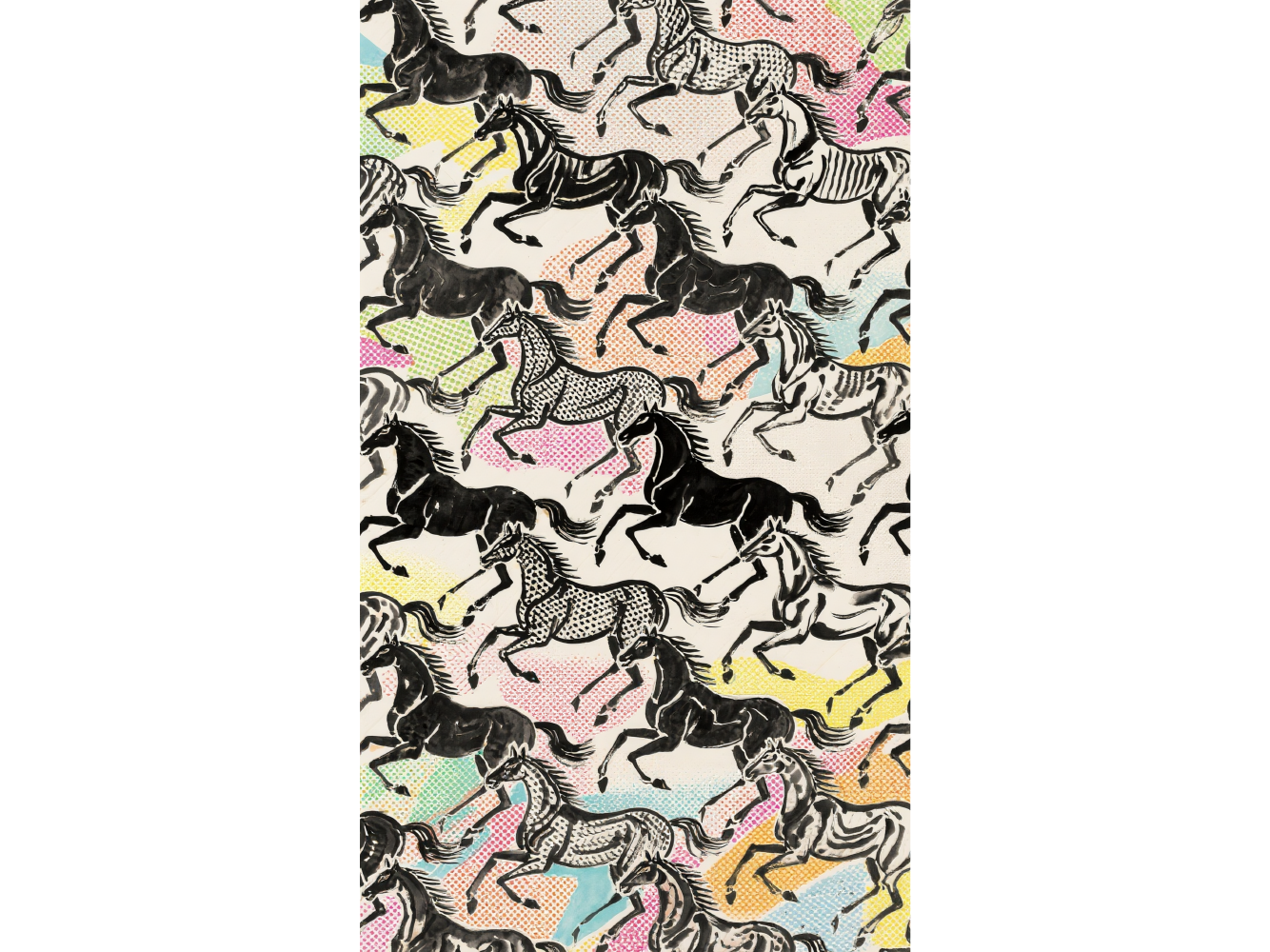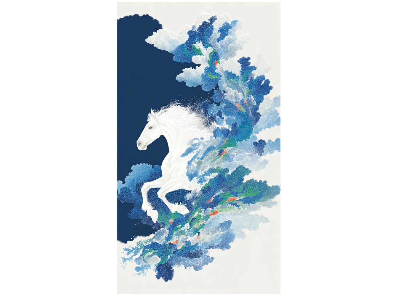 以工笔之形,融水墨之意,绘天马之诗意世界。此系列融汇古今,借花卉山水之美,呈奔腾不羁、潇洒空灵之态。马身负万象,于动静间,尽显阳刚之气与天地和谐之境,寓意灵魂自由,一往无前。