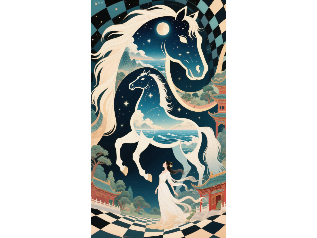 月夜下,神骏白马的巨大剪影灵动飘逸,其轮廓里,往日的场景清晰可见,似在诉说女子与白马走过的过往历程。下方,女子骑白马徐行,身旁海浪翻涌、林木葱郁,星月、碧海与古建筑交融,营造出梦幻又充满东方韵味的意境,仿若一场穿梭于时光与天地间的奇幻骑行。
