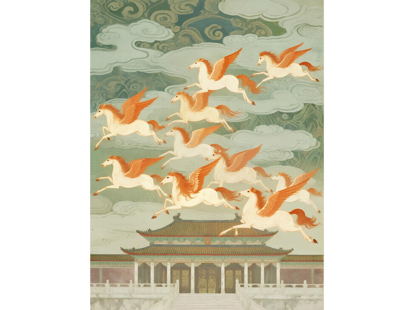 宋代时期的工笔画境中,天马群披丝绸光晕巡游云汉。东方庑殿顶与古典柱式在云霞间辉映,以宣和笔意绘就跨越时空的文明对话。