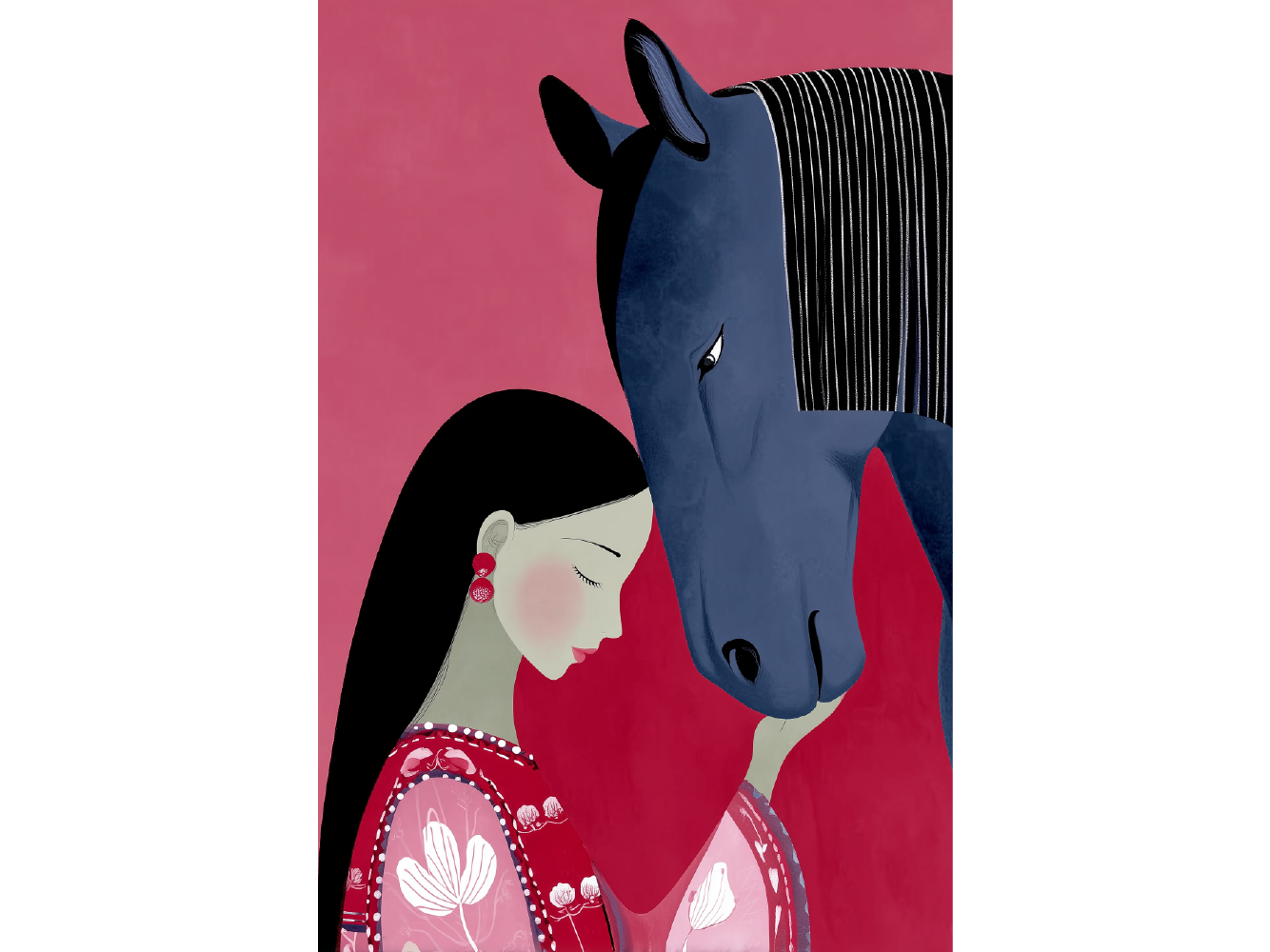 画面以马与人的亲昵互动为核心,运用简洁明快的色彩与流畅线条,营造出温暖、治愈的氛围,传递出人与动物间真挚的情感联结,展现出一种和谐且充满温情的美好意境。