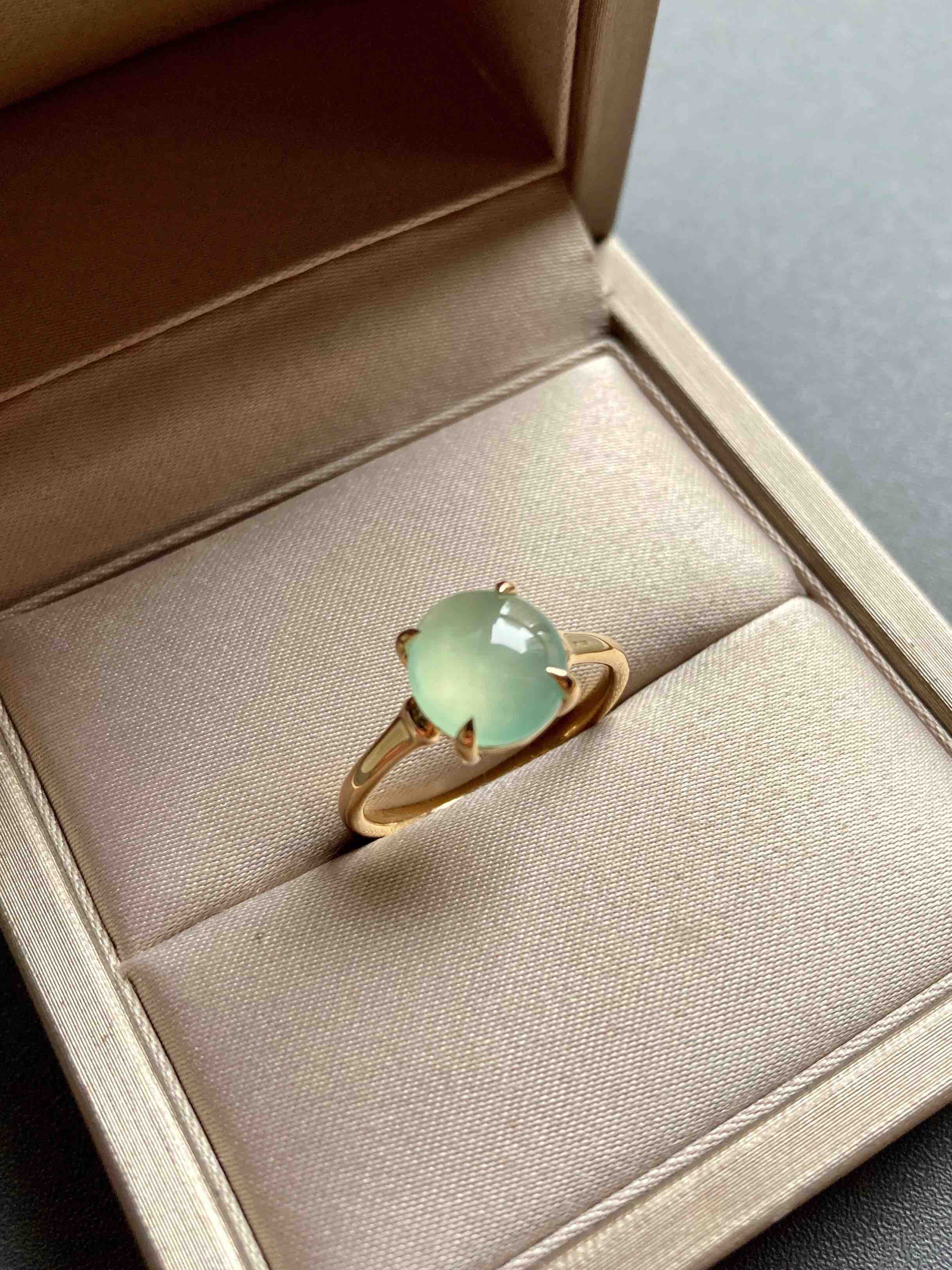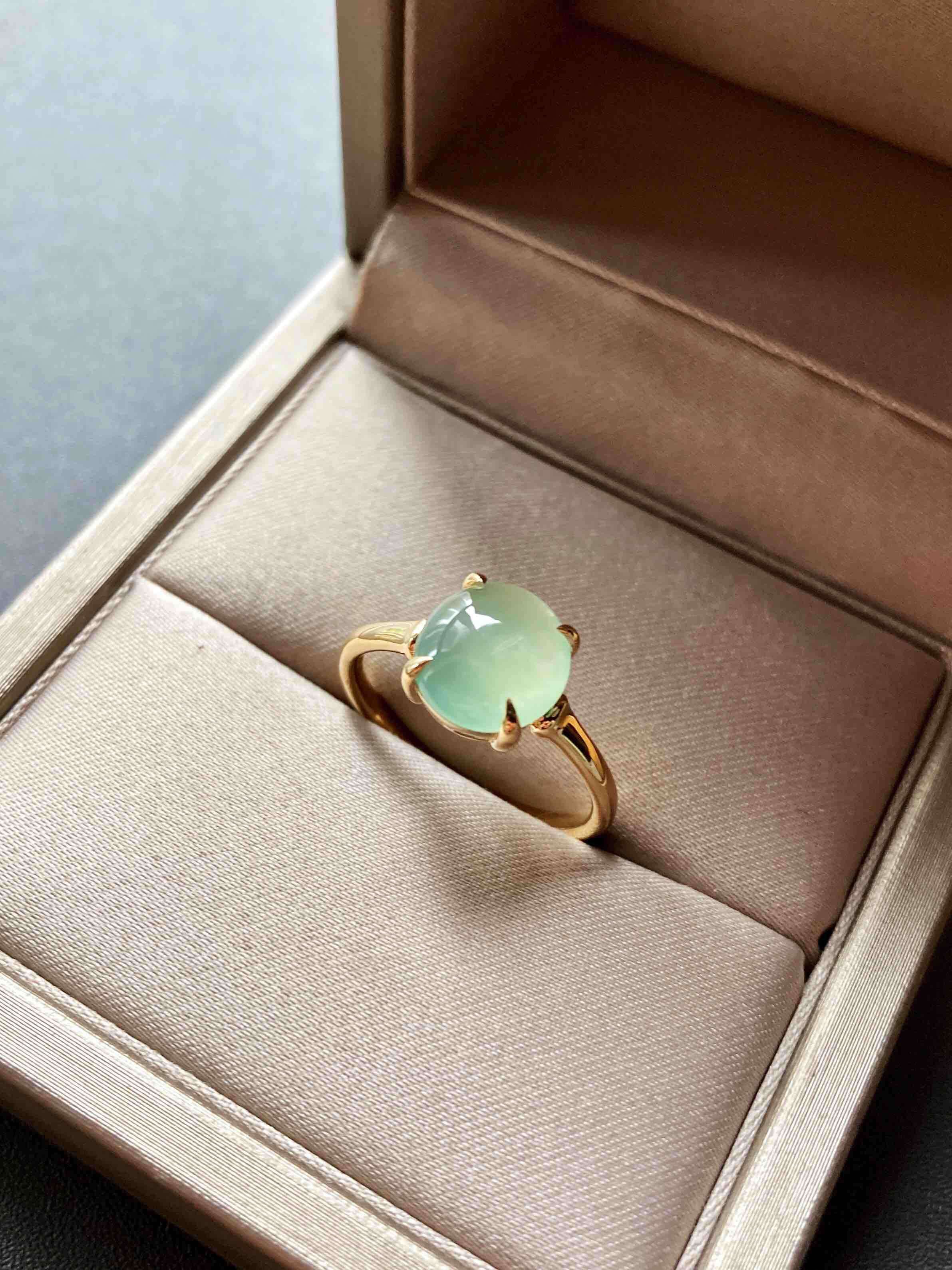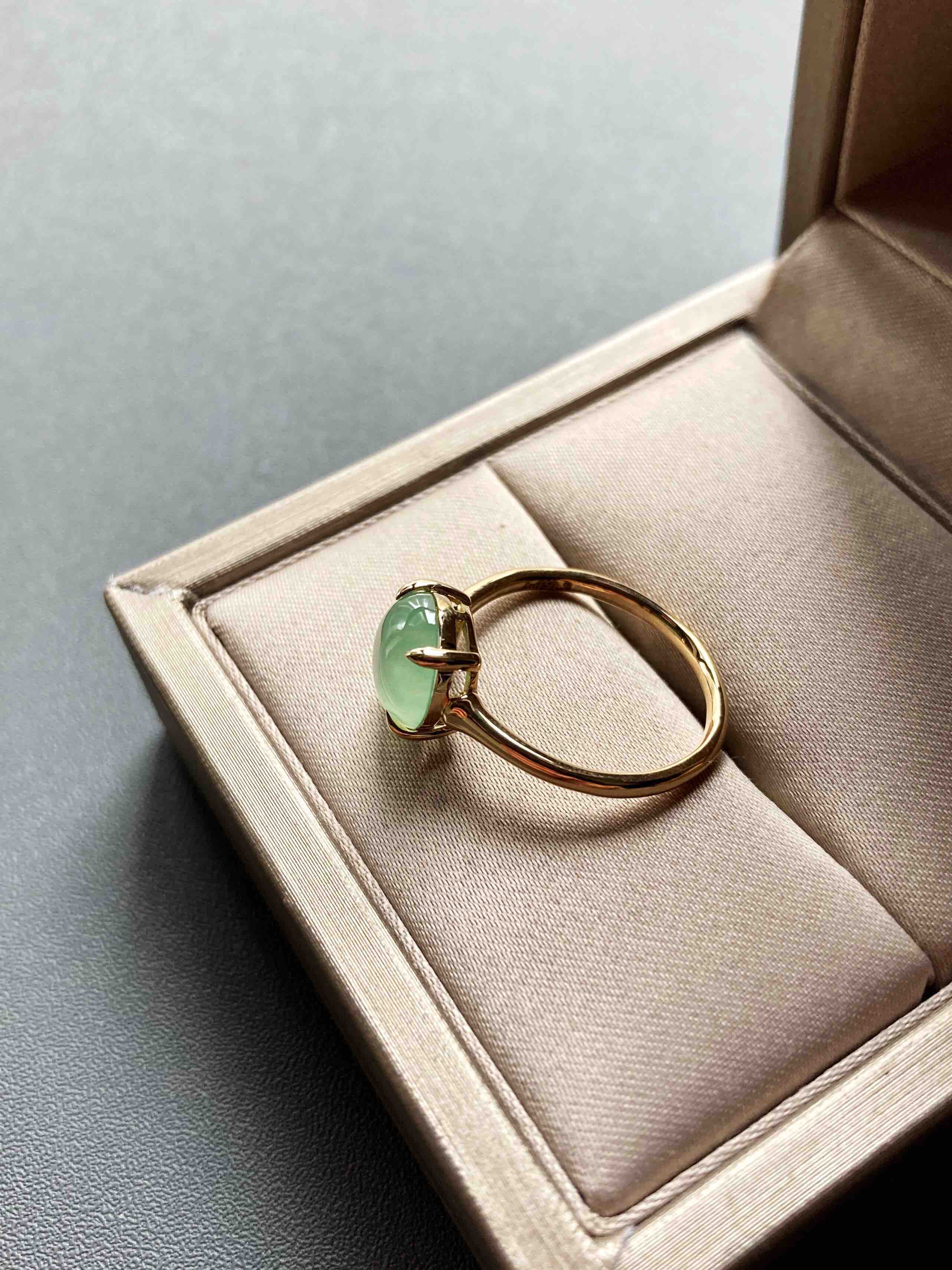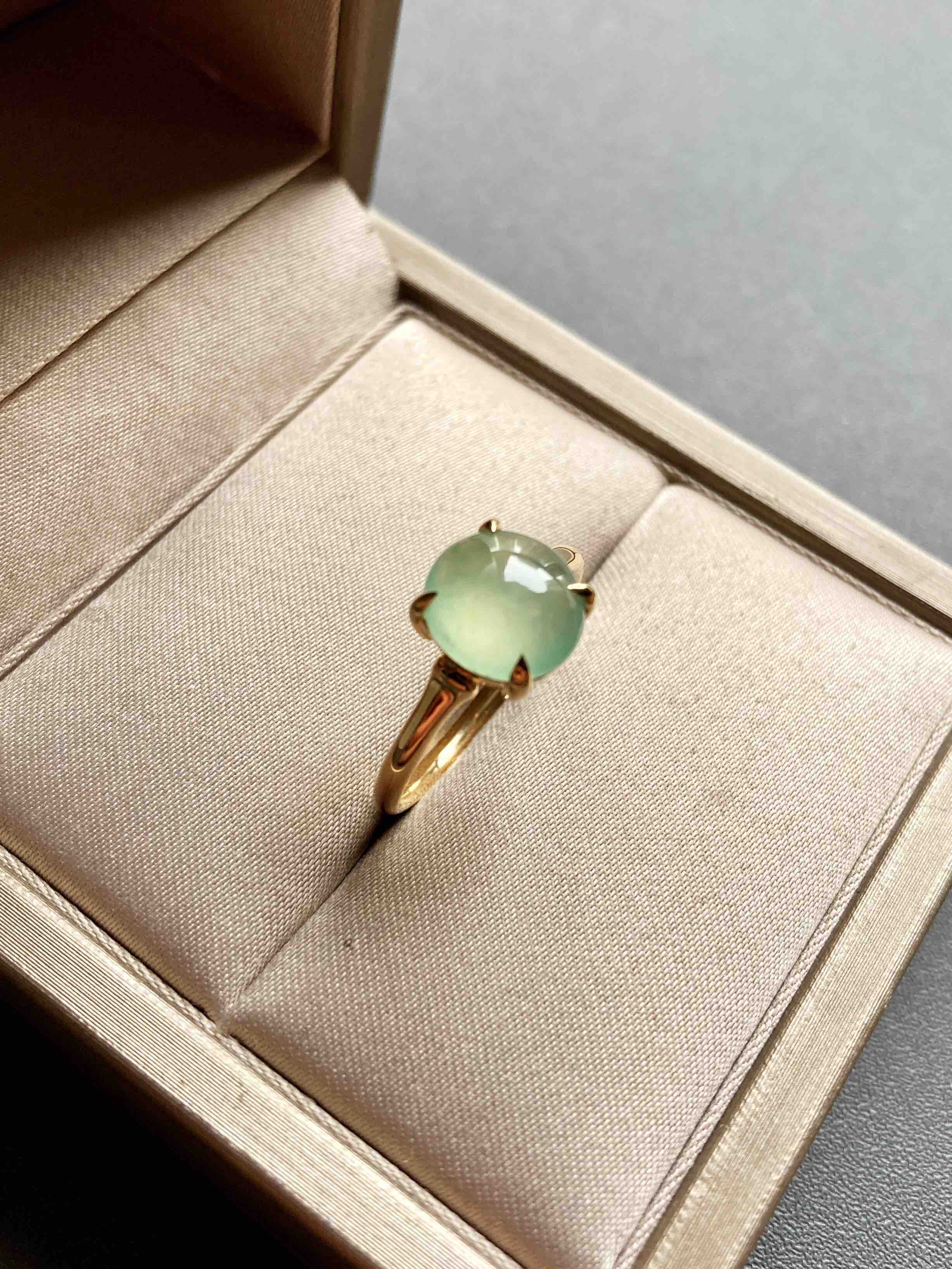 高冰种淡晴水翡翠蛋面戒指18k黄金镶嵌,蛋面8.9×8.5×3mm,种水晶莹剔透,荧光四射,特别高雅的颜色,镶嵌简约而又蕴含小小设计细节,竹节款的造型,高冰种淡晴水与18k黄金简直太搭了,无需更多复杂修饰,这就是好的安排,日常百搭通勤,可以每天陪伴你的漂亮翡翠戒指,圈号13可改大小