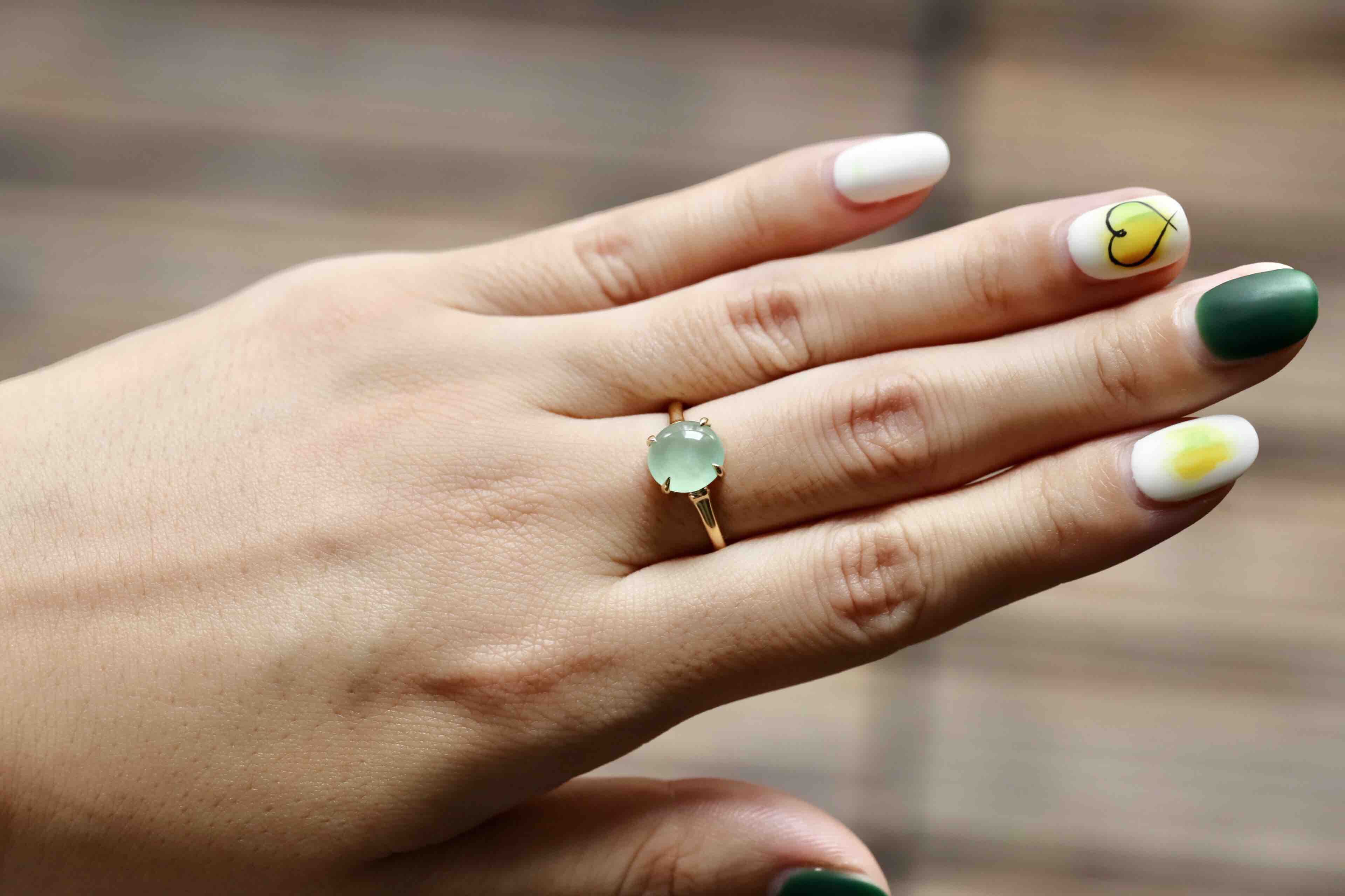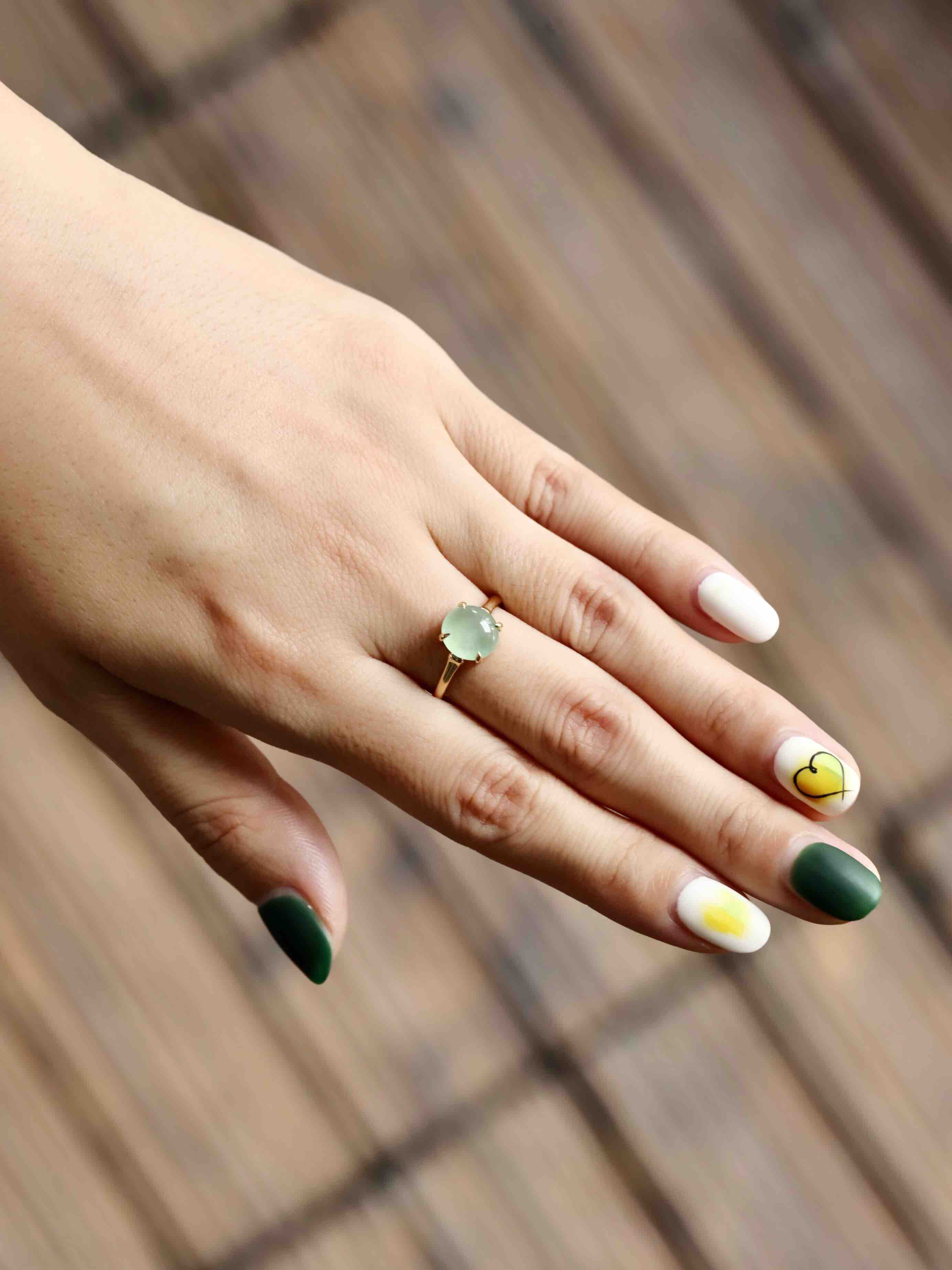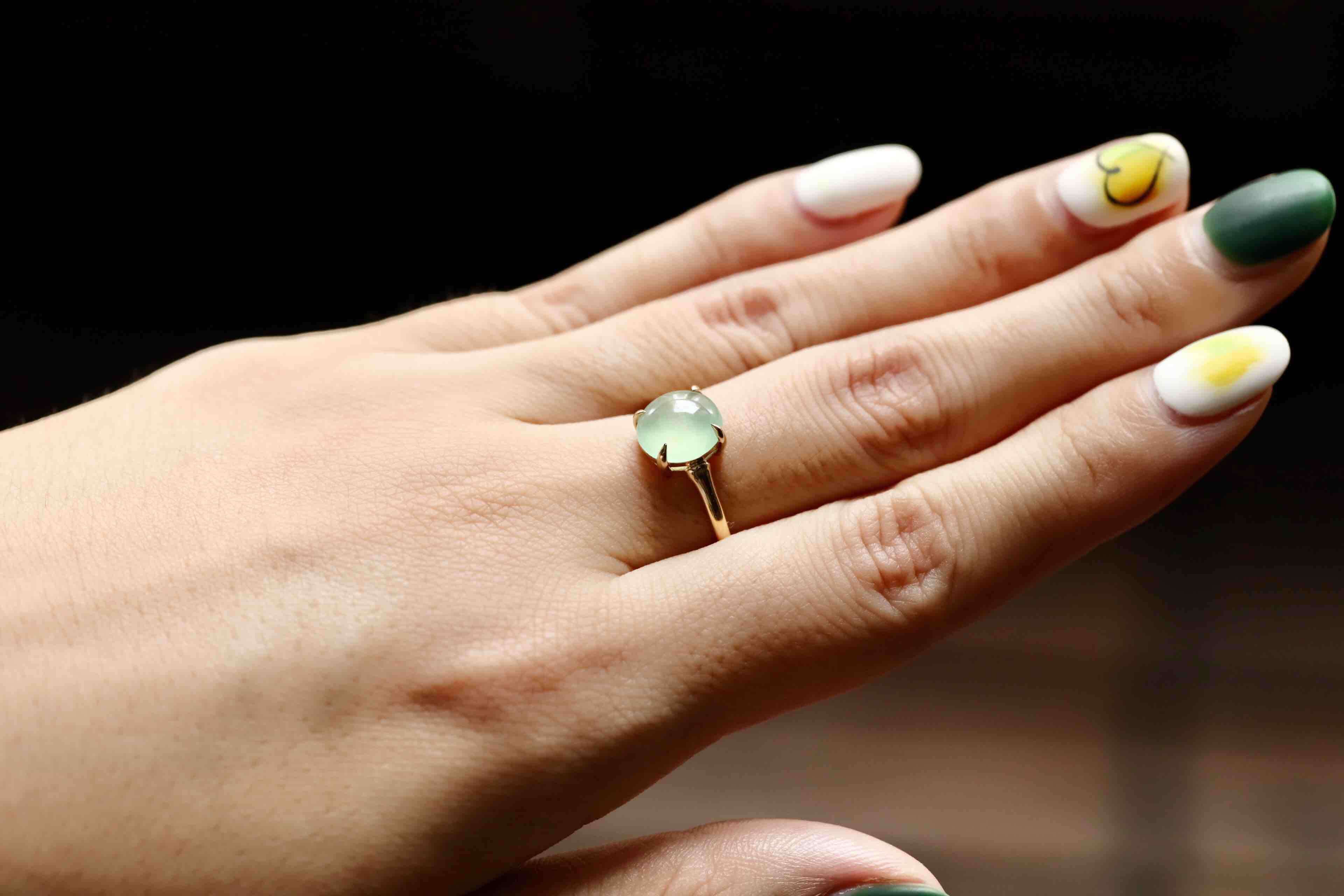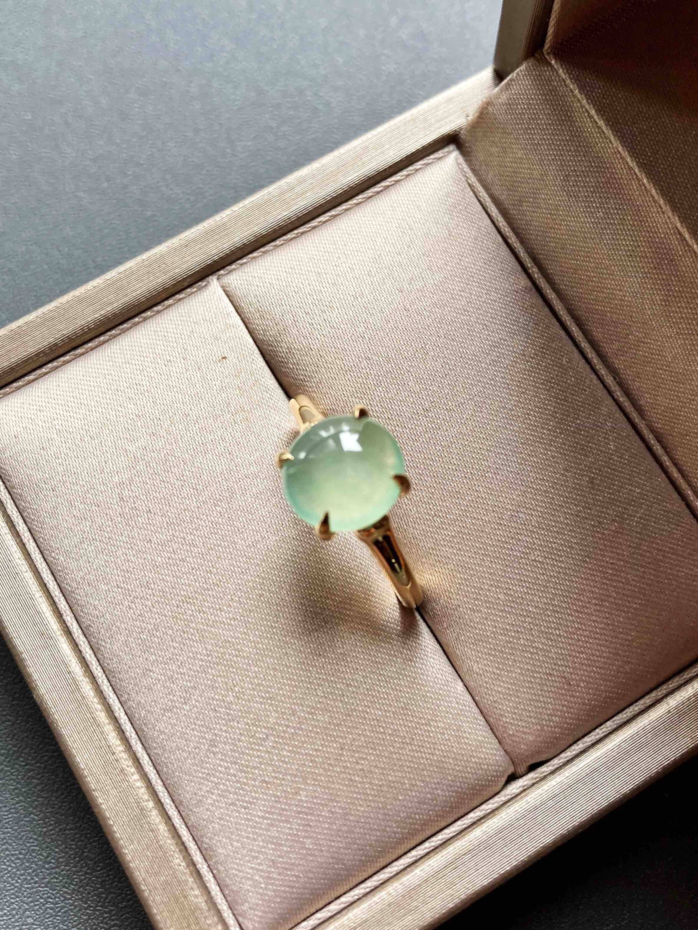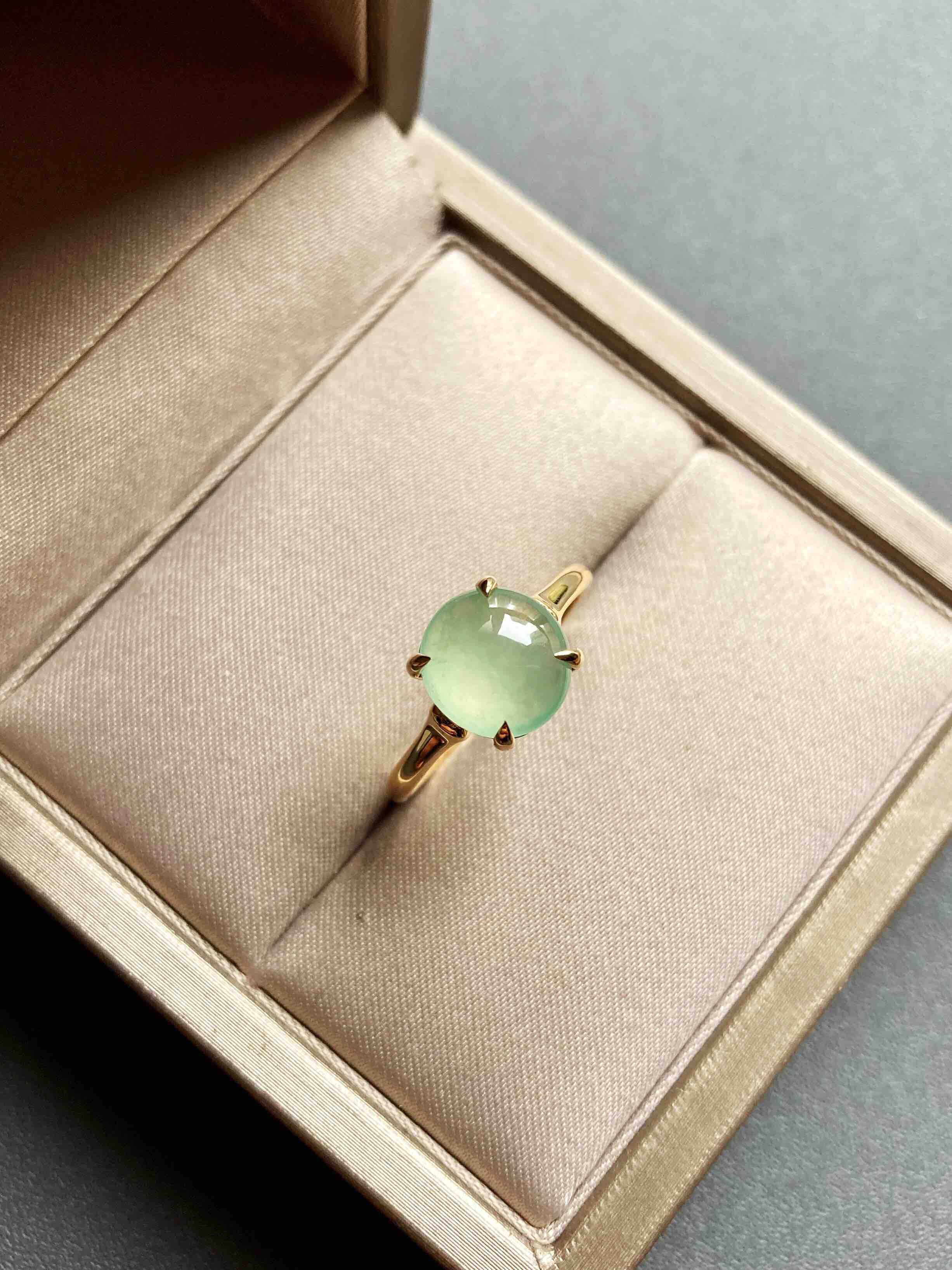高冰种淡晴水翡翠蛋面戒指18k黄金镶嵌,蛋面8.9×8.5×3mm,种水晶莹剔透,荧光四射,特别高雅的颜色,镶嵌简约而又蕴含小小设计细节,竹节款的造型,高冰种淡晴水与18k黄金简直太搭了,无需更多复杂修饰,这就是好的安排,日常百搭通勤,可以每天陪伴你的漂亮翡翠戒指,圈号13可改大小
