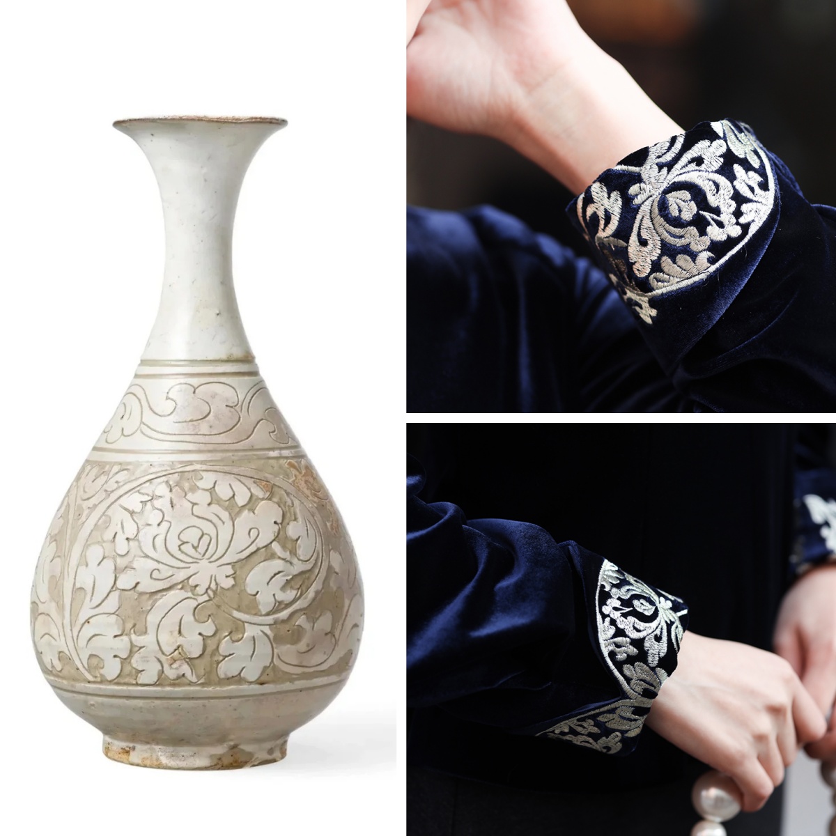 💠刺绣图案提取自宋朝磁州窑剔划花纹莲玉壶春瓶上的缠枝莲纹,枝茎环绕,叶片舒展翻卷,生机盎然。