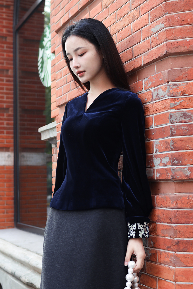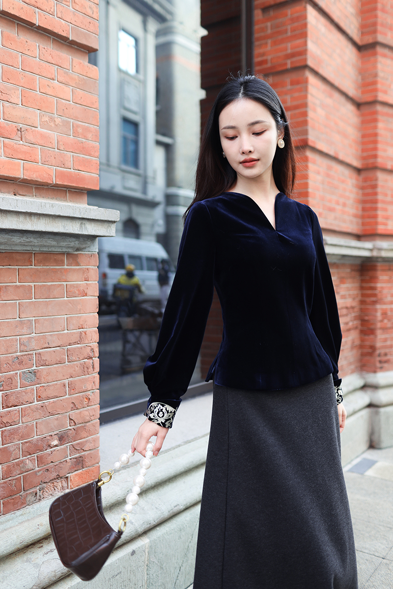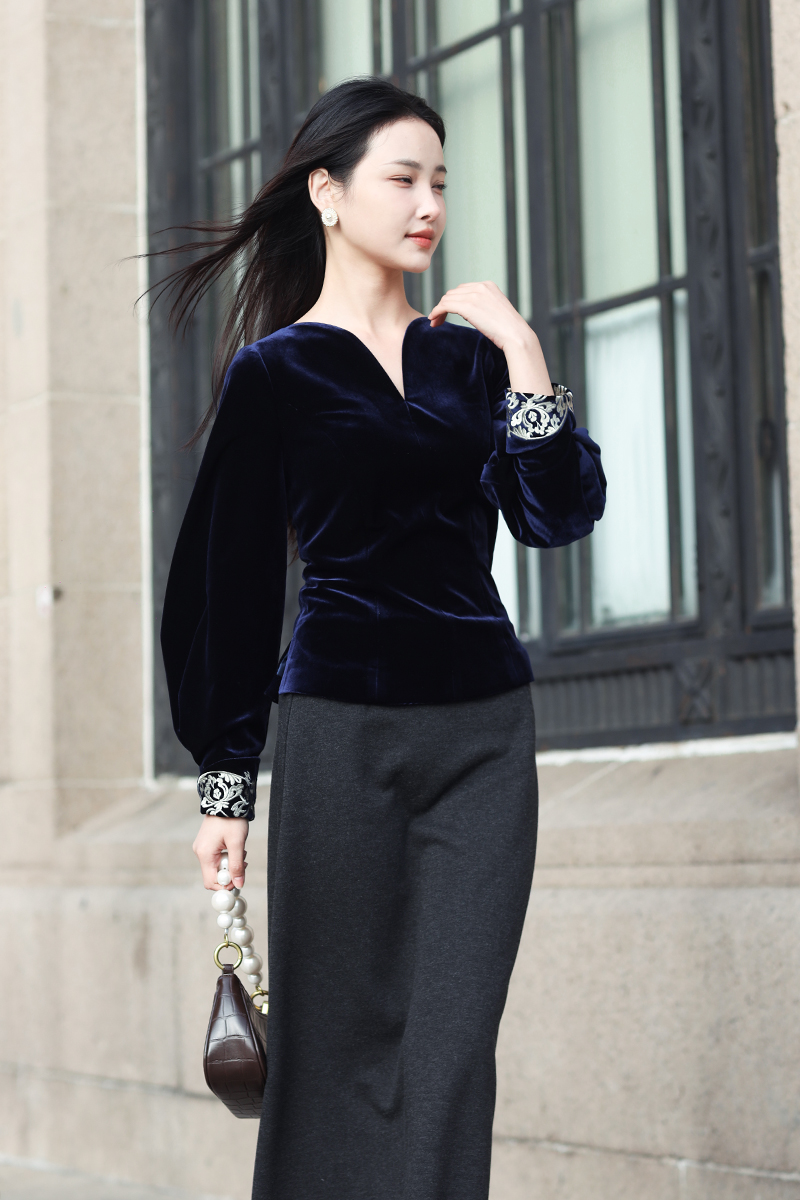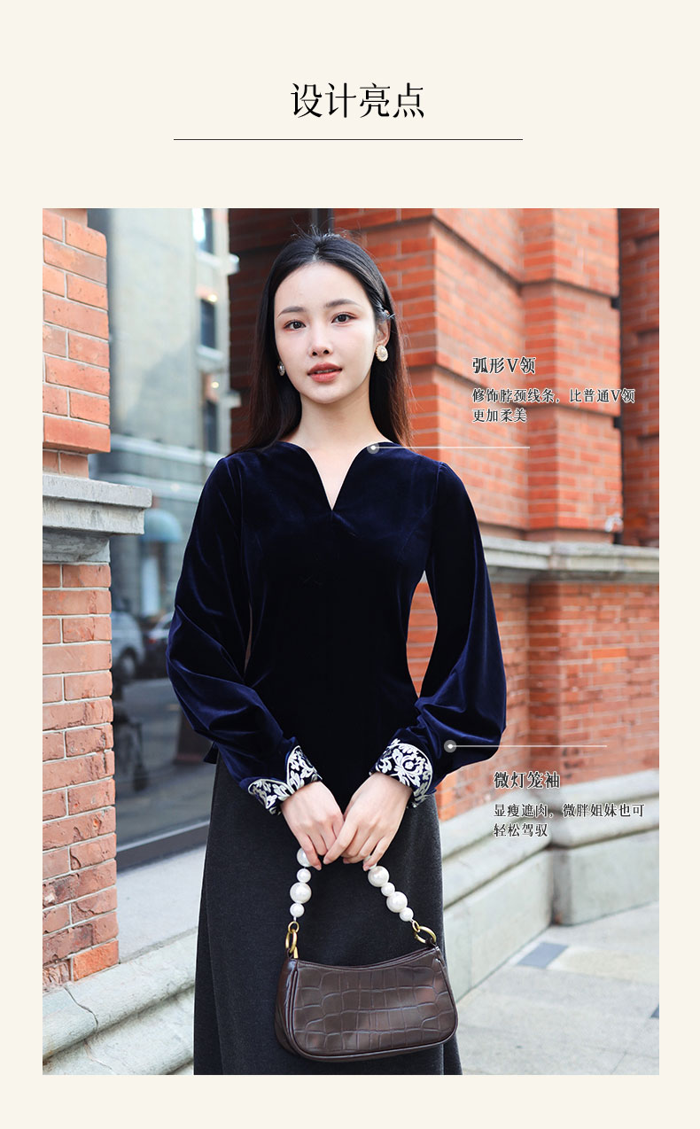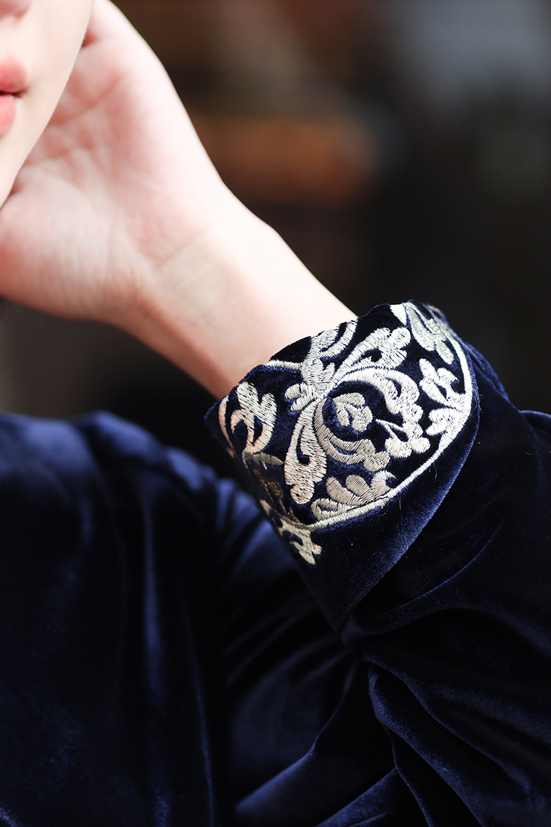 丝绒的光泽和袖口的金丝线相互辉映,贵气十足~~ 就喜欢这种简简单单又能显得贵气的设计