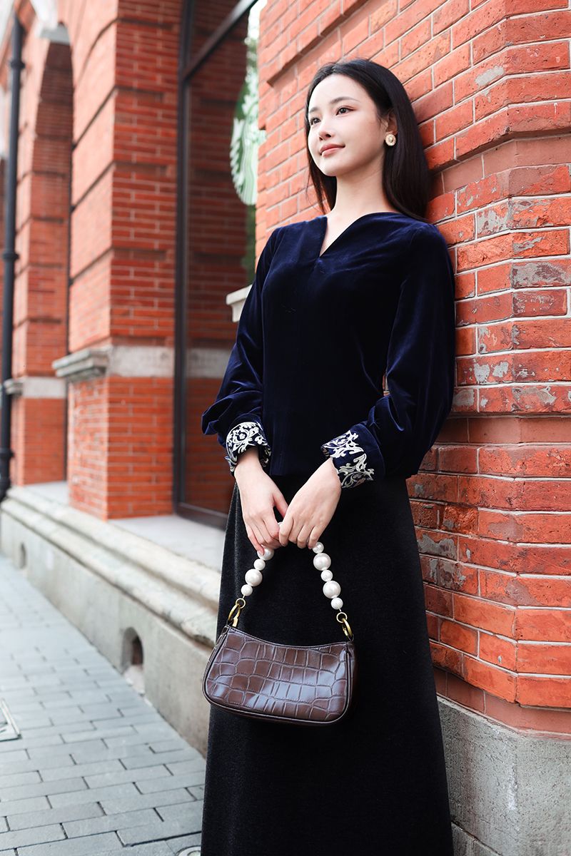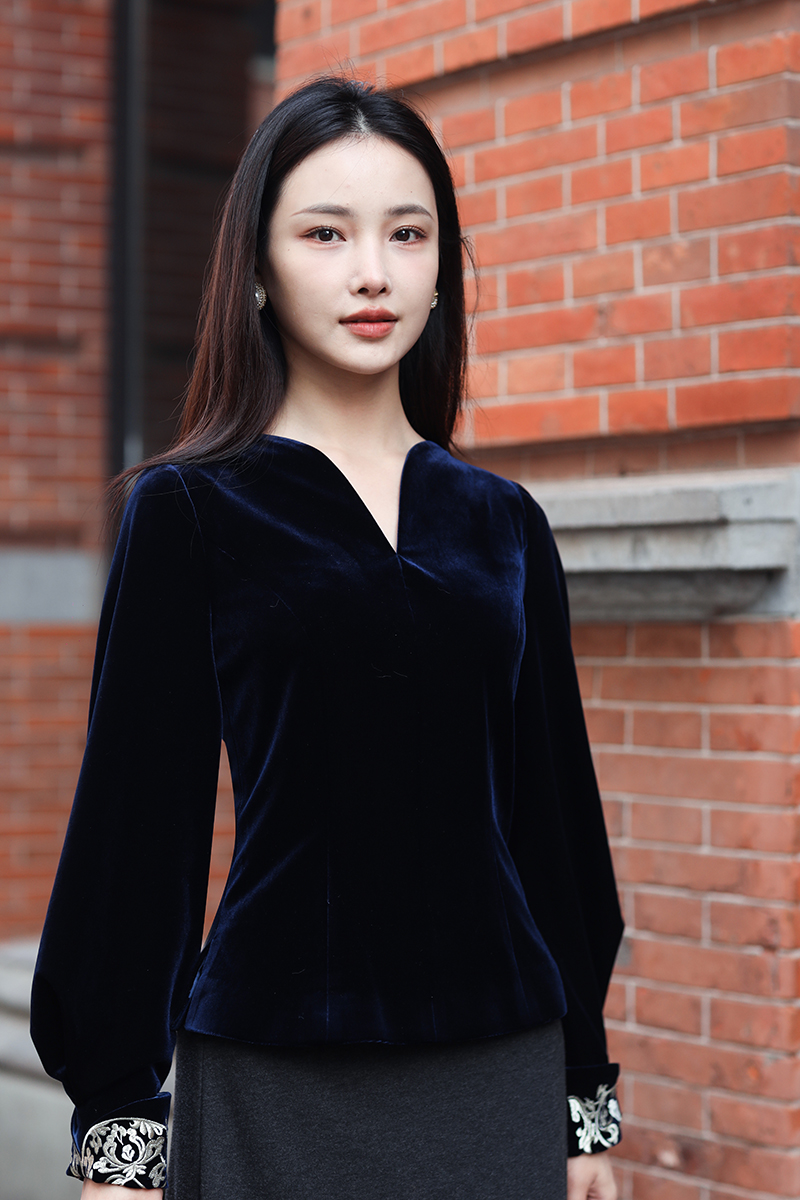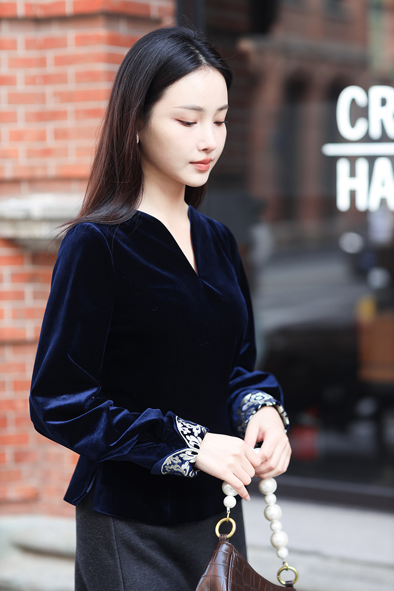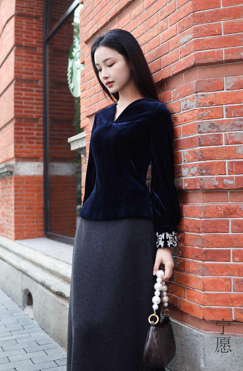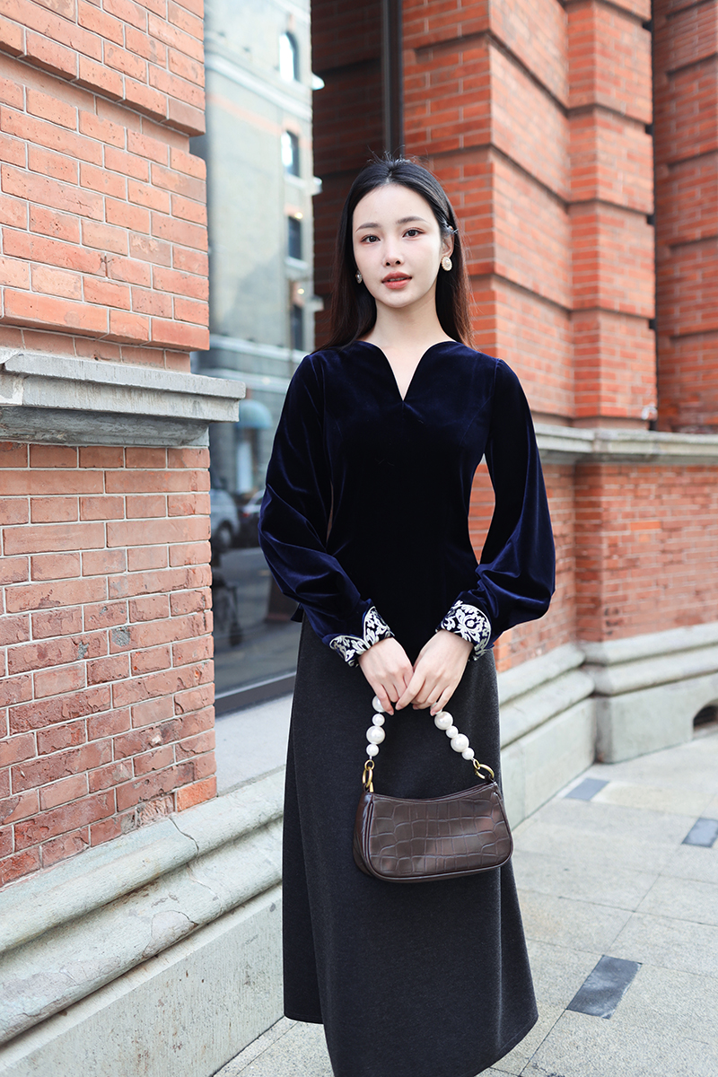 丝绒的光泽和袖口的金丝线相互辉映,贵气十足~~ 就喜欢这种简简单单又能显得贵气的设计
