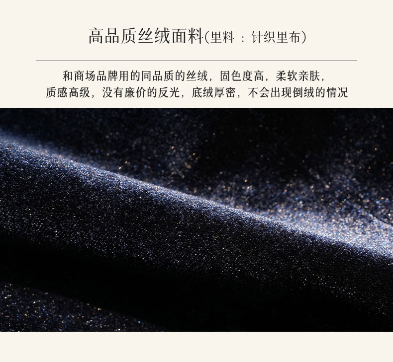 是奢牌用的同品质丝绒,固色度高,柔软亲肤,质感高级,没有廉价的反光,底绒厚密,不会出现倒绒的情况~!!